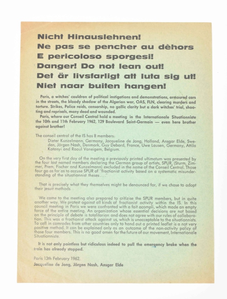(1) Contains the pamphlet Nicht Hinauslehnen; Ne pas se pencher au dèhors; E pericoloso sporgesi!; Danger! Do not lean out!; Det är livsfarligt att luta sig ut!; Niet naar buiten hangen! Paris, 13 February 1962. Black ink on green stock, 23.5 x 17.5 cm. Tract issued by Jacqueline de Jong, Jørgen Nash, Ansgar Elde in protest of the exclusion of the Gruppe Spur members by the IS Conseil Central in Paris. Brown toning and moderate creasing along borders, text very clear. Almost not noticeable tiny tear on lower edge, 2 mm.