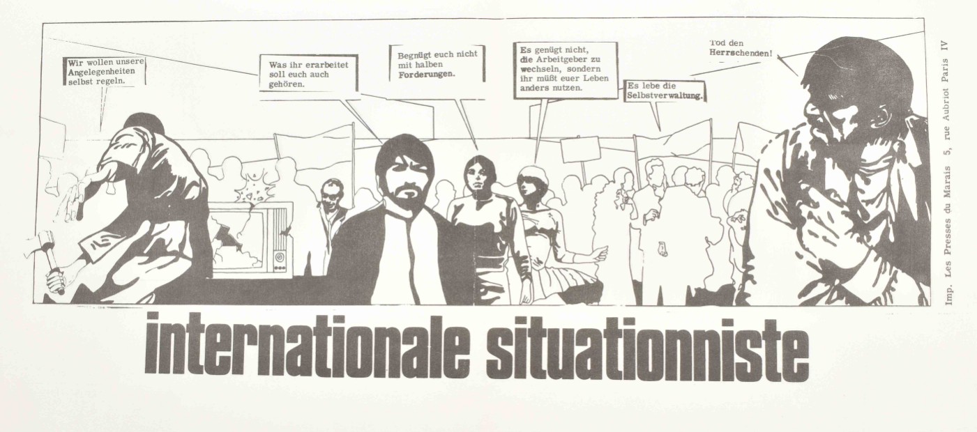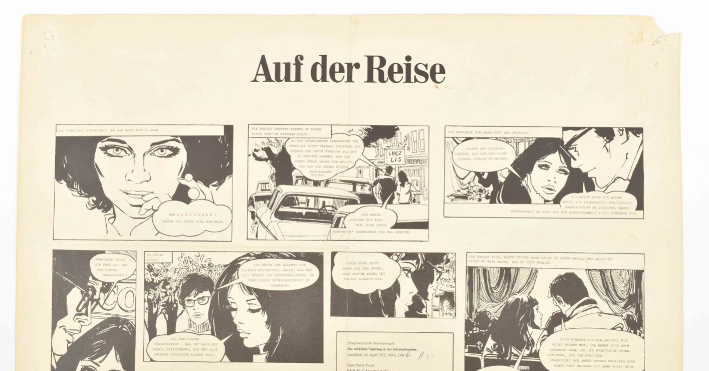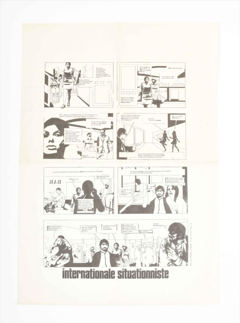 (1) Includes the German language version of the poster 'Dans le décor spectaculaire ou le regard ne contre que les choses et leur prix', originally from 1967 which served to announce the release of Internationale Situationniste #11. Comics designed by Bertrand with text attributed to Raoul Vaneigem, published by Les Presses du Marais, Paris. This copy printed black on white thick paper, 61 x 43 cm, folded 3 times, with moderate toning and creasing.