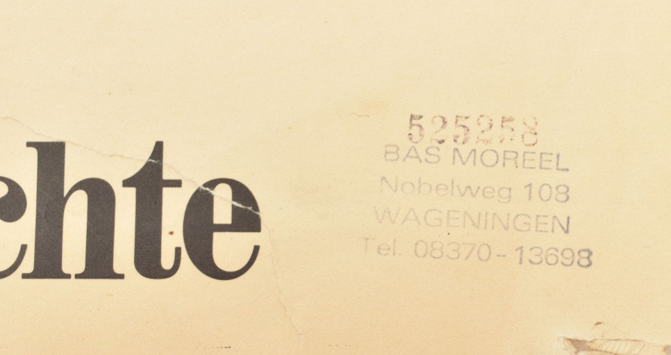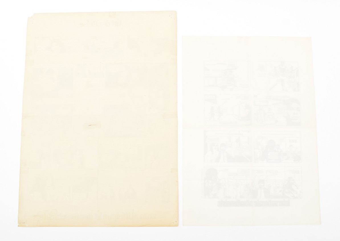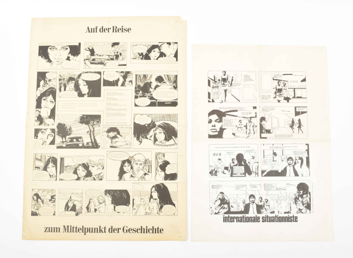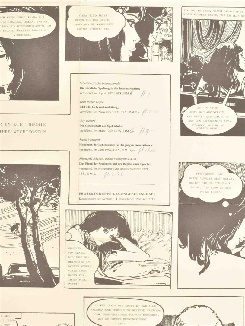 (2) Auf der Reise zum Mittelpunkt der Geschichte. Printed black on offwhite paper, 69.5 x 50 cm, folded 3 times. Detourned comix style design promoting Situationist publications available through the Projektgruppe Gegengesellschaft in Dusseldorf, with prices in German Mark and Dutch Guilders added in blue handwriting. Undated, c. 1973. Contains a stamp on lower right corner of Bas Moreel, a publisher/distributor of anarchist literature in Wageningen. Copy with aging, wear and repair on all corners. (total 2)