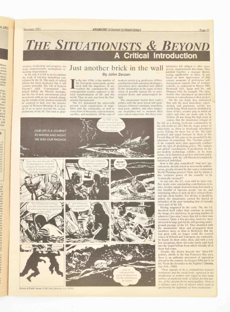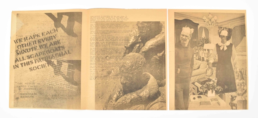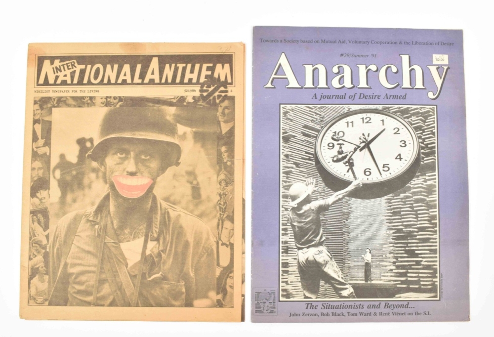 (3) Anarchy. A Journal of Desire No.19, Summer 1991. Columbia, C.A.L Press. Theme issue on The Situationists and beyond. Copy shows moderate water damage. (4) Anarchy-Comix No.30 1985. Toulouse, Agora Libertaire. (5) Anarcho Punk fanzine 'International Anthem: A Nihilist Newspaper for the Living, January 1979. The domestic violence issue, 34 x 27 cm. Created by Gee Vaucher from the Punk band Crass. Copy with age wear, horizontal tear of approx. 5 cm on right border going through all pp. Added: (6) King Mob 3. London, May 1969. This is not an original issue, but an early thermofax on beige paper, 30 x 21.5 cm, 16 pp. stapled at top left. Page 2 has a small piece cut out (no text seems to be missing). British counter-culture magazine published by David & Stuart Wise, Christopher Gray, Donald Nicholson-Smith and TJ Clark, all former members of the British Section of the Situationist International. (total 12)
