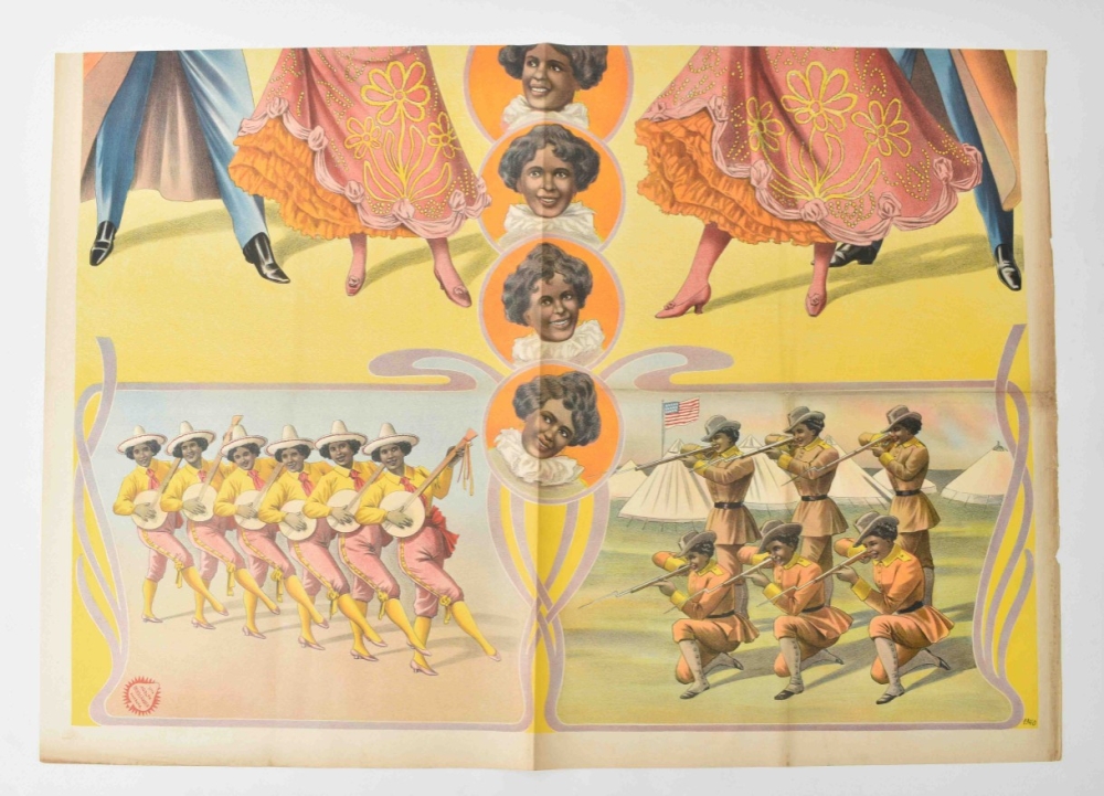 The opening scene was "Hustlin' & Bustlin' on a Cotton Plantation", displaying the women slowly chanting "My Old Kentucky Home". The second scene, "Banjo Serenade" was followed by the "Cake Walk", a dance originating from the black slave plantations. The performance ended with the "Rough-Riders" act, where the women were dressed in military uniform with rifles.