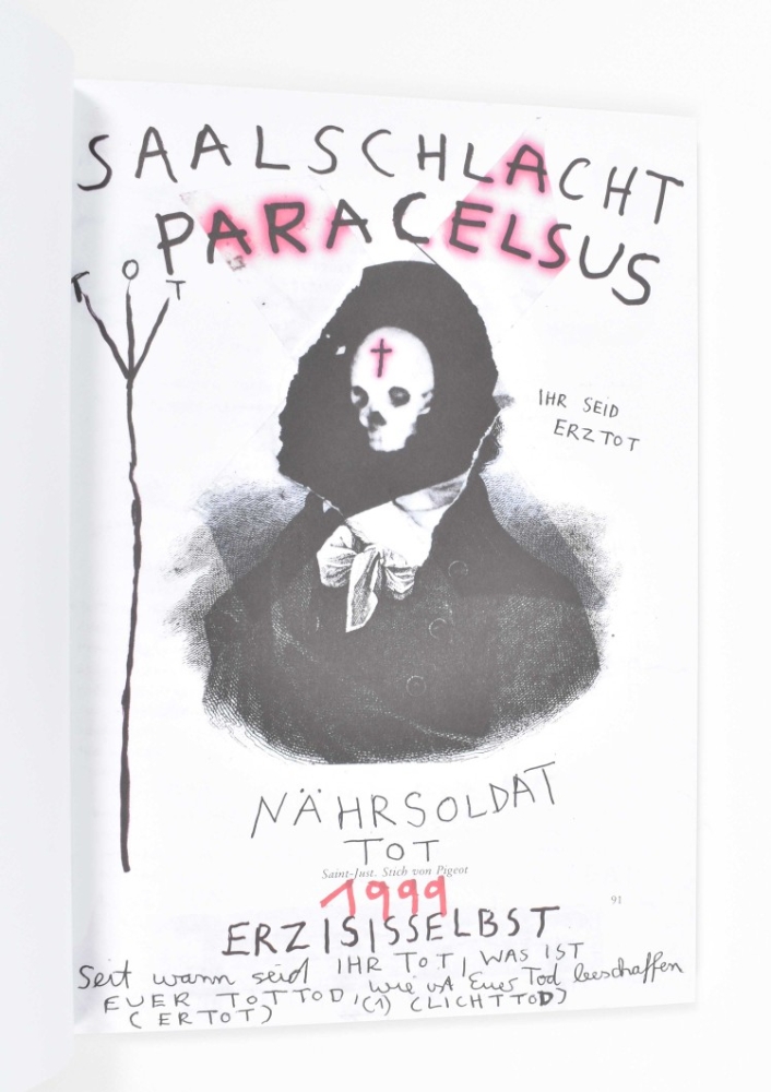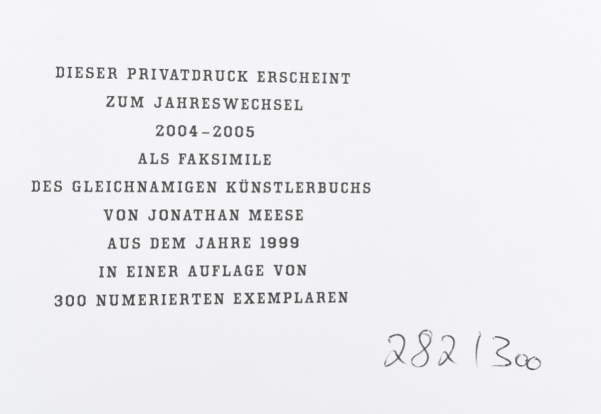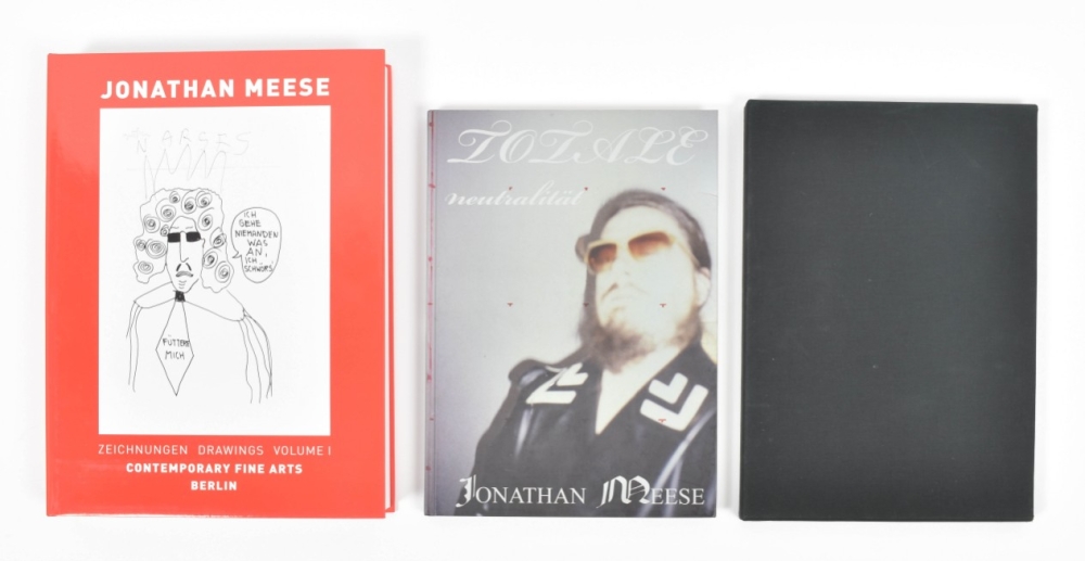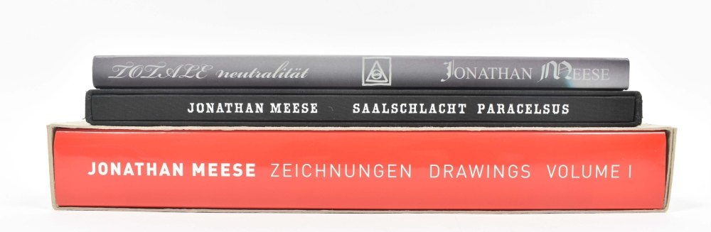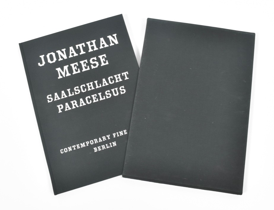 (2) Saalschlacht Paracelsus. Berlin, Contemporary Fine Arts, 2005. Hardcover housed in clothbound slipcase, 31.5 x 22 x 2 cm, 96 p. entirely executed in facsimile. Copy from a hand-numbered edition of 300, this is 282/300. (3) Jonathan Meese: Zeichnungen Drawings Volume I. Berlin, Contemporary Fine Arts, 2008. Hardcover housed in cardboard slipcase, 34.5 x 25 x 4.5 cm, 372 p., illustrated throughout. All copies in mint condition. (total 3)