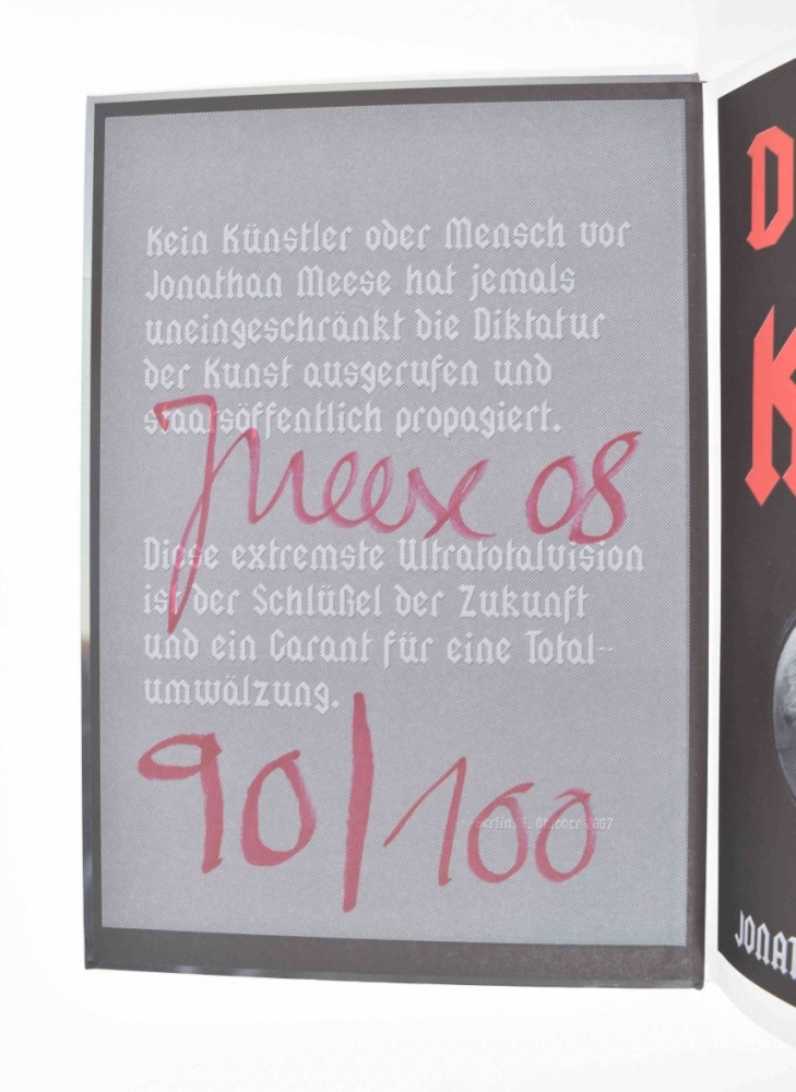 (1) Totale Neutralitat. Cologne, Walther König, 2008. Hardcover, 30.5 x 21.5 cm, 136 p. including DVD. Deluxe edition of 100, this one signed, dated (08) and numbered 90/100 in red marker. Contains a unique collage by Meese.