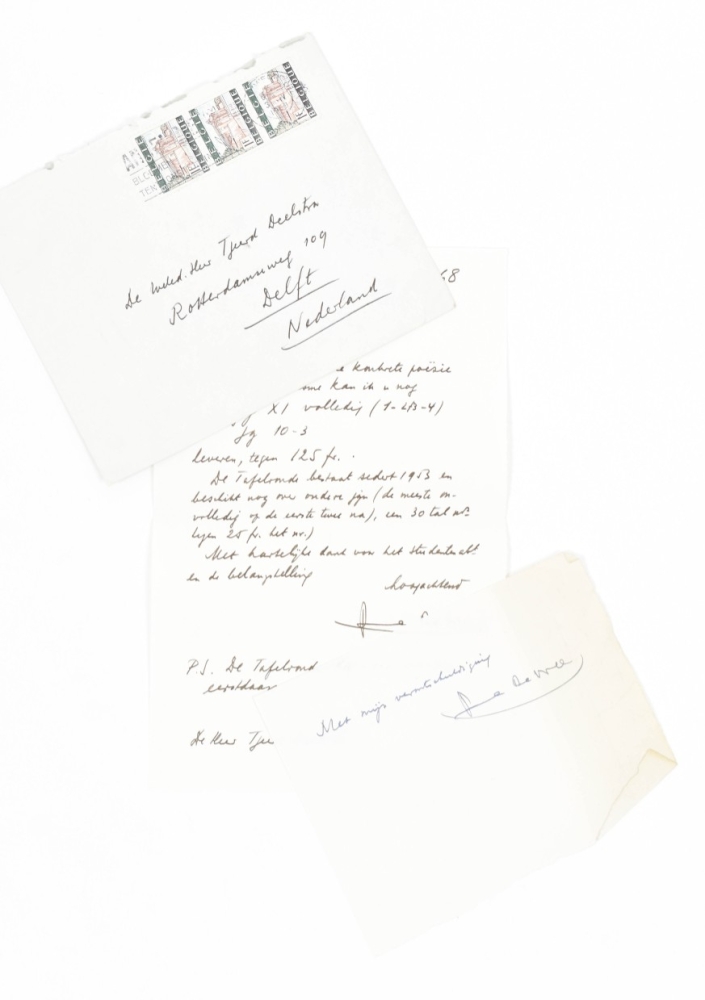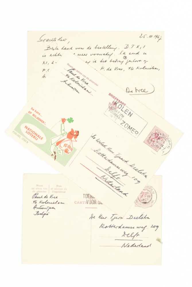 Text mostly in Dutch, some French, with concrete poems in various languages. Copies show moderate age wear on covers, interiors are fine. Included are: (1) X- 3. 1965, Essentialisme 2. (2) XI-1. January 1966, Dada's Berliniale. (3) XI- 2/3. July 1966. Konkreet Kinetiek Fonetiek. (4) XI-4. 1966, Hommage a Raoul Hausmann. (5) XII-1/2. April 1967 Konkrete poëzie crirythme film audiopoëzie provo. (6) XII-3. August 1967. Omnibus. With original sending envelope. (7) XII- 4. December 1967. Discojoie. Plus original sending envelope. (8) XIII 1-2. April 1968. Hommage a Man Ray. (9) 4 notes sent by Paul de Vree regarding orders of the magazine. (total 12)
