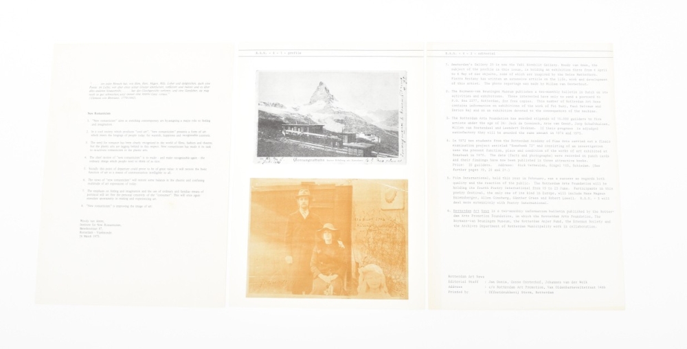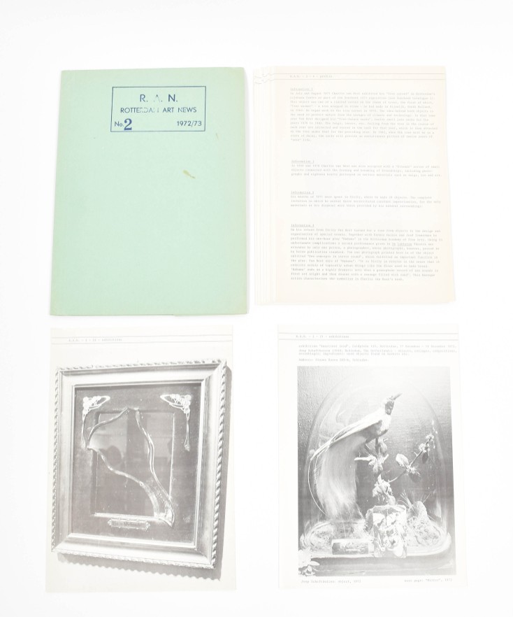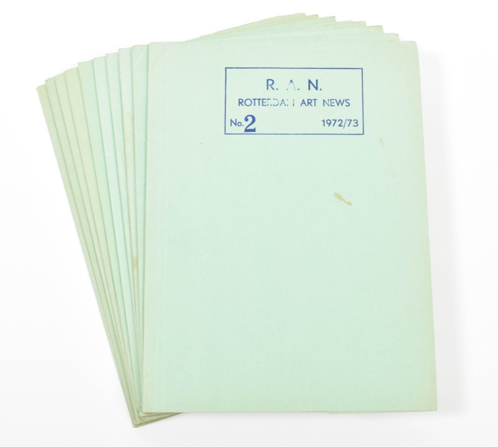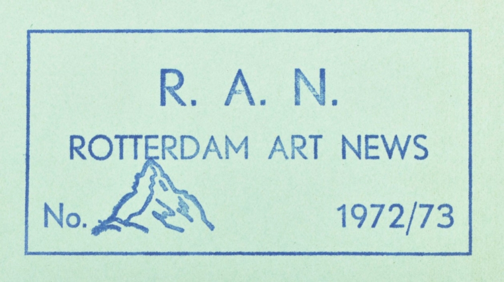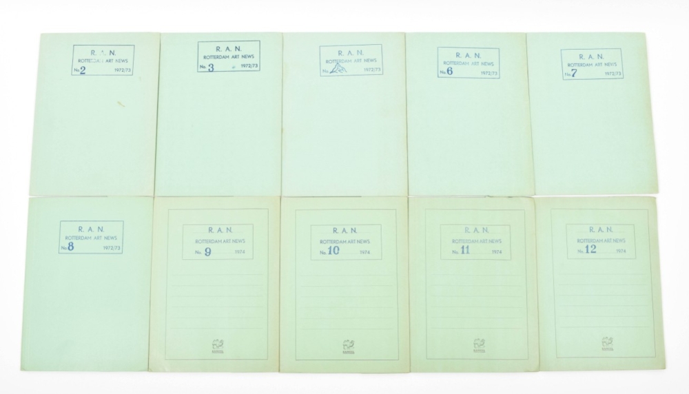Ten issues (out of 12 all published) of R.A.N. Rotterdam Art News published by the Rotterdam Arts Promotion Foundation between 1972-1974. Edited by writer and critic Jan Donia, Gosse Oosterhof and Johannes van der Wolk, to promote the new Rotterdam art scene and entice international collaborations. All issues housed in a green stamped portfolio, 23 x 31 cm, containing loose sheets with texts and b/w ills.