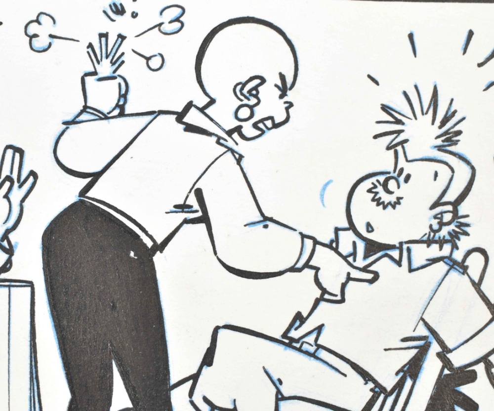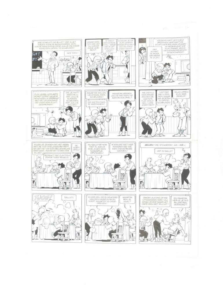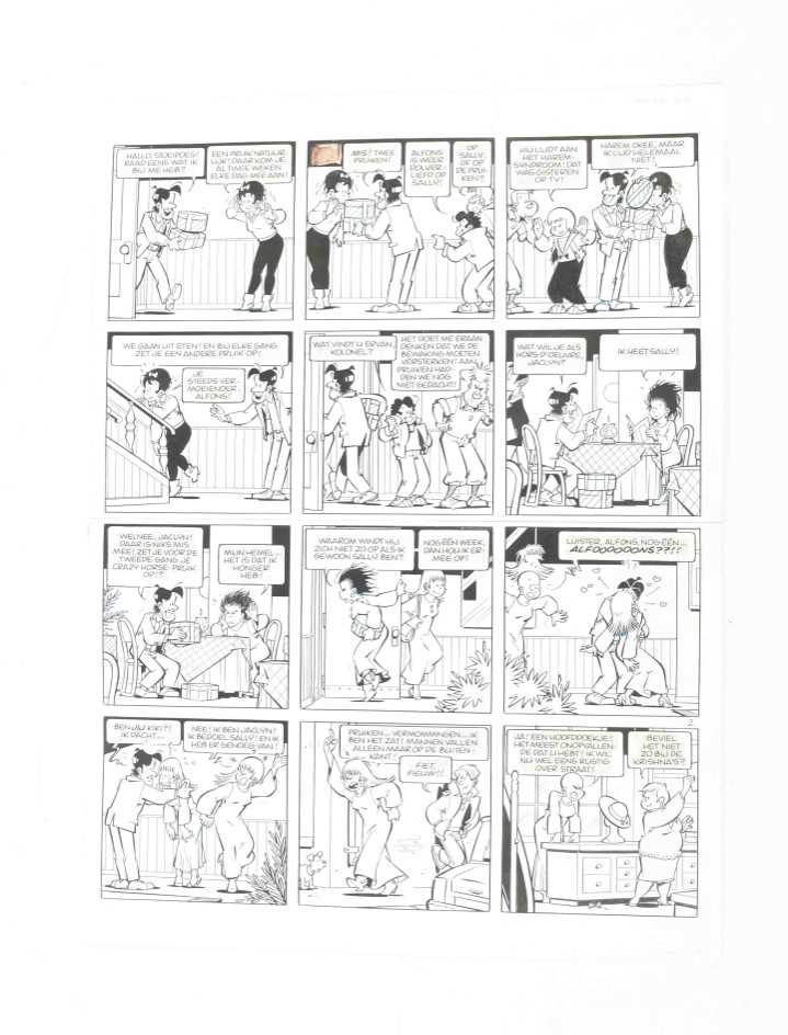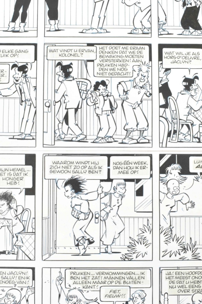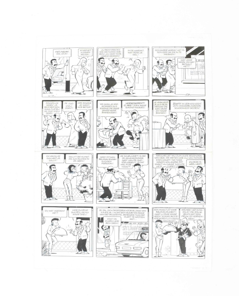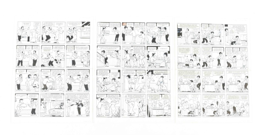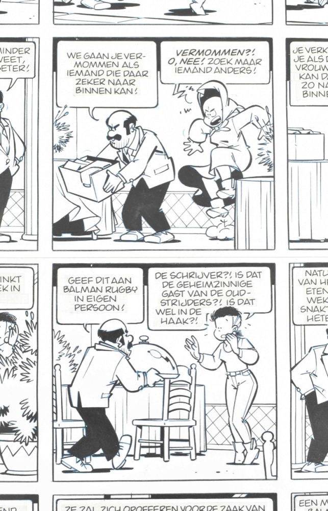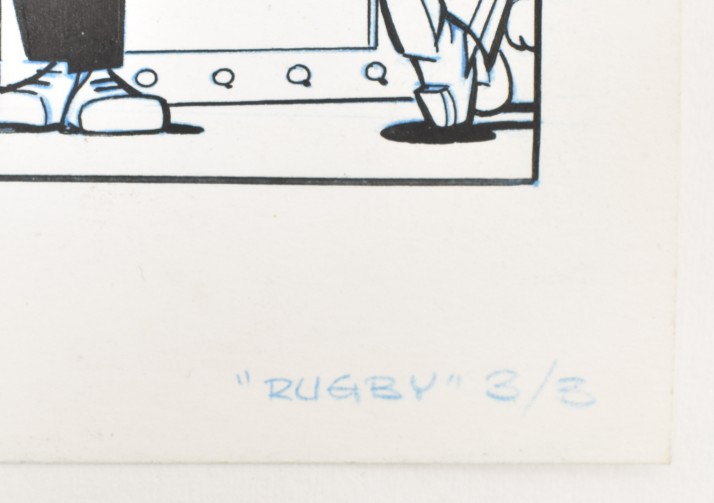 Rugby. Three consecutive original pages in India ink, published in Sjors and Sjimmie, ca. 1984. Each page 45 x 33 cm.