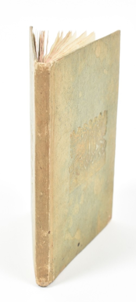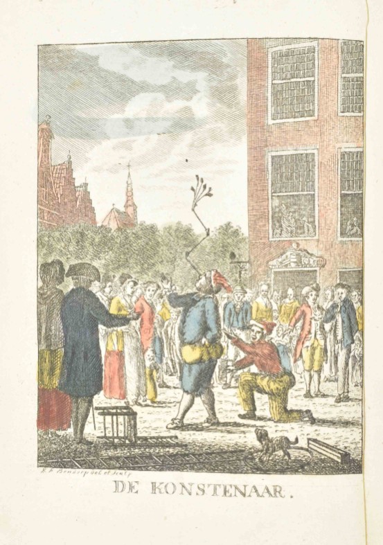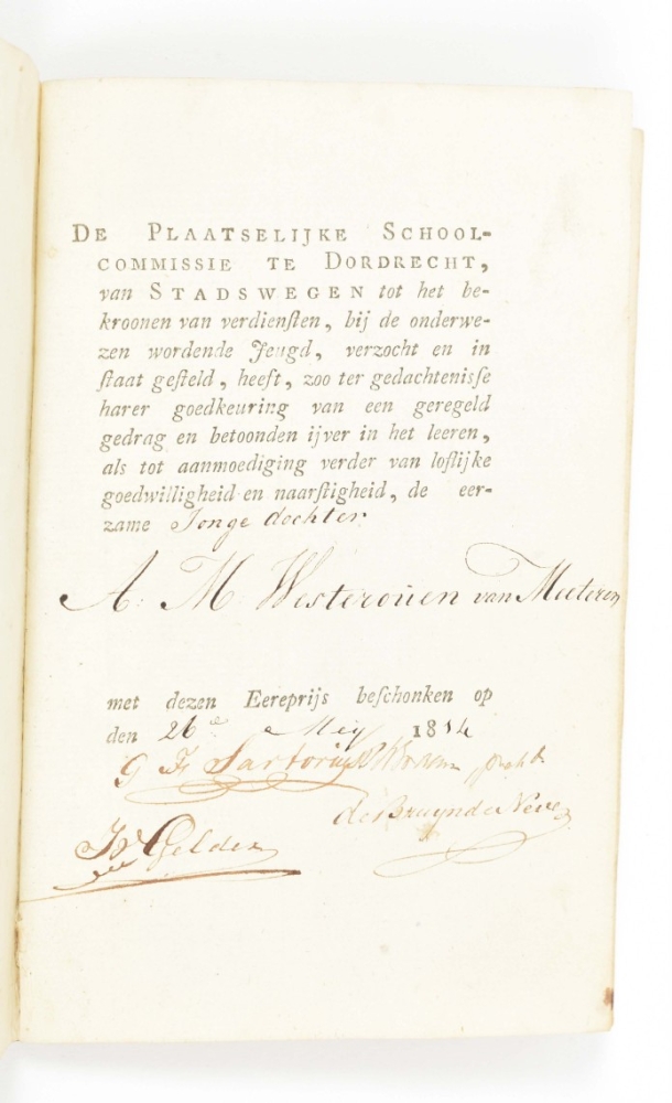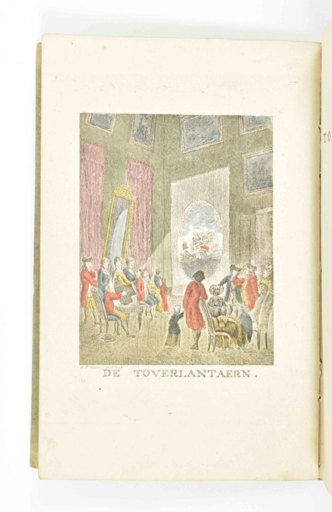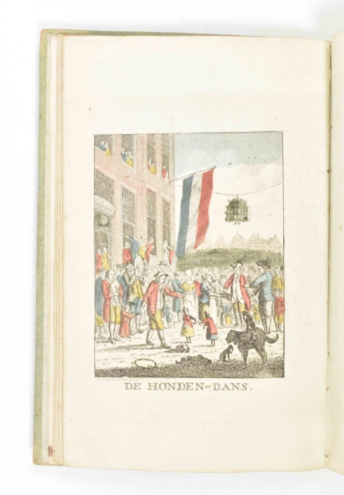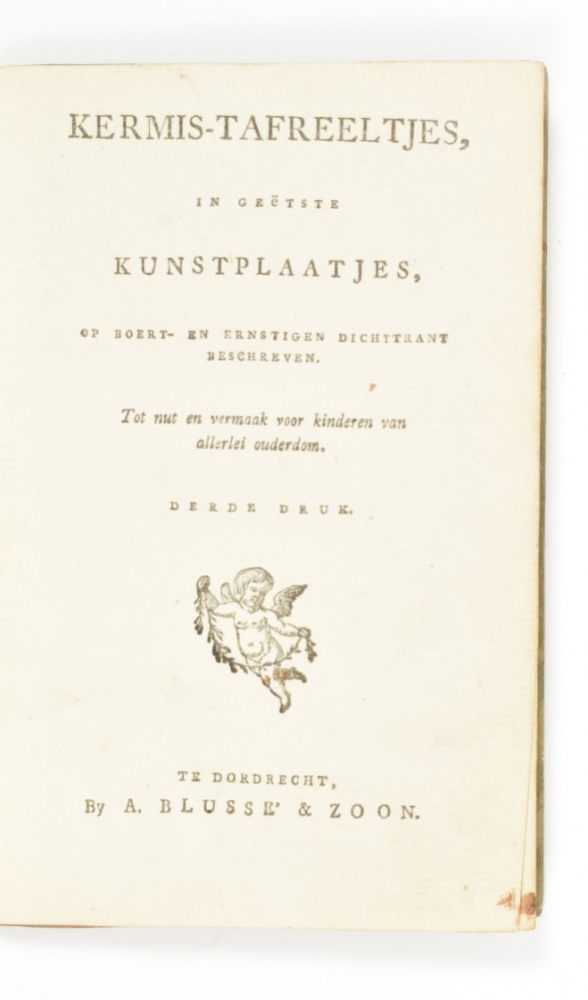 Very good and attractive copy w. just some minimal defects. With letterpress schoolprize filled out in pen, awarded to "Jonge dichter A.M. Westerouen van Meeteren" on 26 May 1814, signed by the members of the school board G.F. Sartorius, W.J. de Bruyn der Neve and J Gelder in pen. Rare. Cat. The Children's World of Learning 3711 (this ed., dating the first ed. 1794); Buijnsters, Bibliografie van Nederlandse school- en kinderboeken 1700-1800, 1452 (dating the first ed. ca. 1790). The engravings were first published in 1782 to illustrate he work Vaderlandsche Kermisvreugd, with poems by Roelof Arends. A second series under the title Vaderlandsche Kindervreugd appeared in 1794. Comprises: De lierman; De draaister; De konstenaar; De liedjeszangsters; de hondendans; De koekkraam; De gochelaar; De Tooverlantaarn.