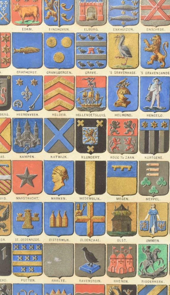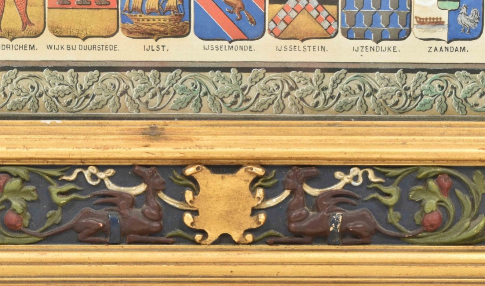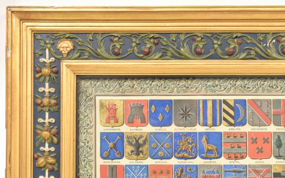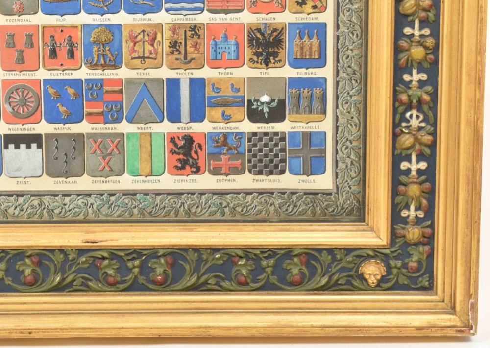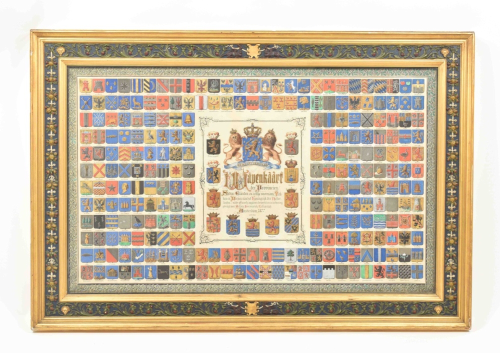 A magnificent large piece by the master-calligrapher Antonie Grevenstuk, award-winning founder of the specialist Grevenstuk family firm, later including his sons Jean, Edouard and Thierry Grevenstuk. The drawing incorporates the large coat-of-arms of the Netherlands carried by two lions and 11 coat-of-arms of the provinces surrounding the title and within calligraphed border in the centre. This central field is surrounded by 252 coat-of-arms of Dutch cities and villages in alphabeticial order, starting with Aardenburg and ending with Zwolle. A frieze of scrolls composed from oak-lvs neatly borders the drawing. The luxurious frame perfectly matches its contents. The Rijksmuseum preserves a wood-engraved allegorical laudatory print on Antonie Grevenstuk, by Isaac Weissenbruch, illustrating the esteem Grevenstuk had earned with his skills.