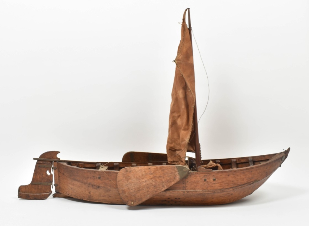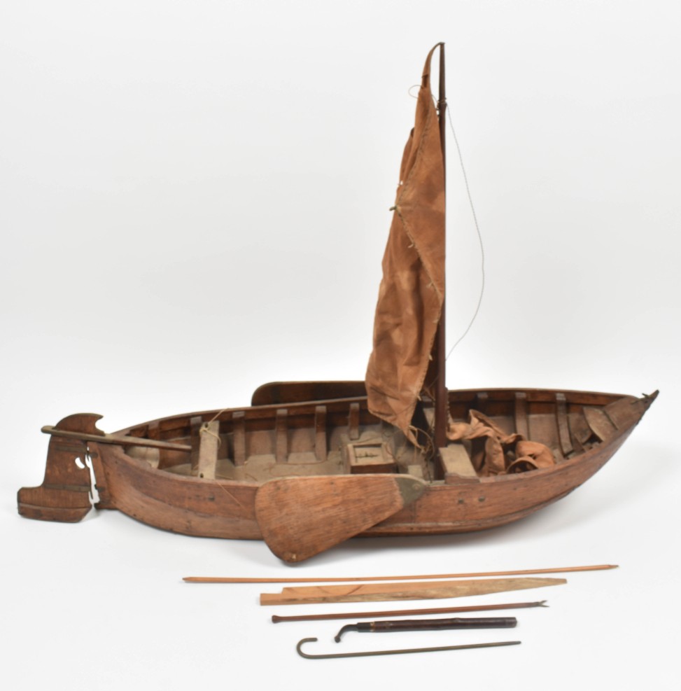 Late 19th or early 20th cent., length 100 cm (incl. rudder), constructed of oak, copper and sailcloth.