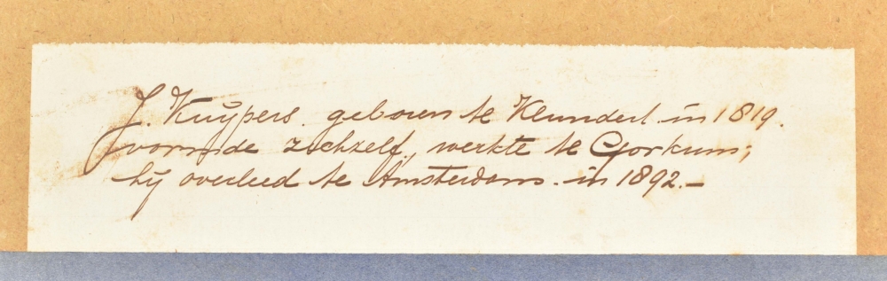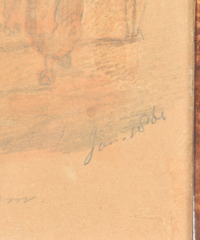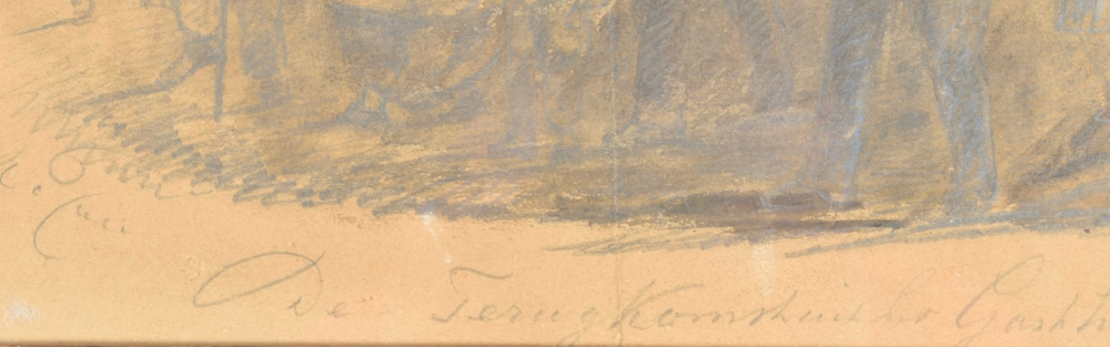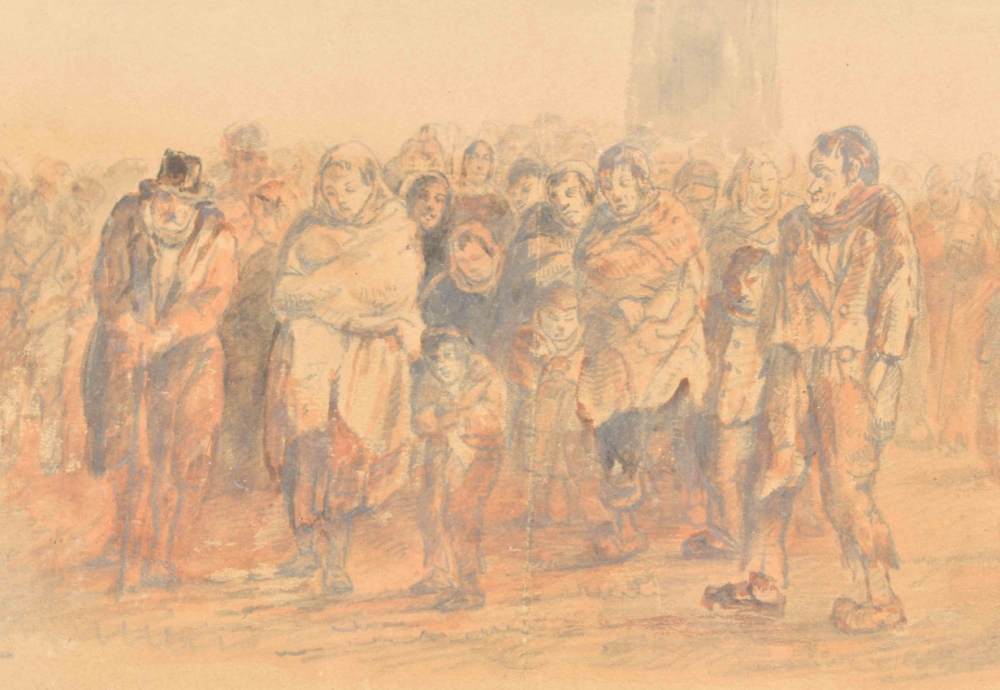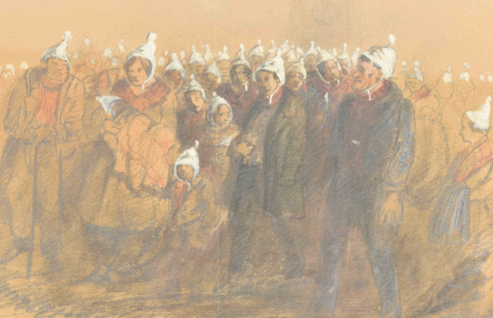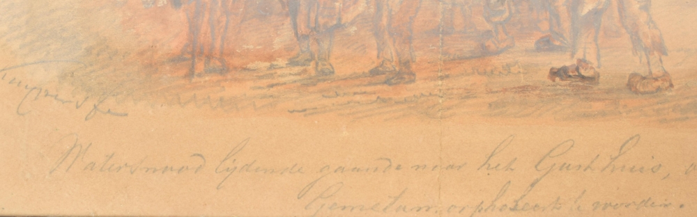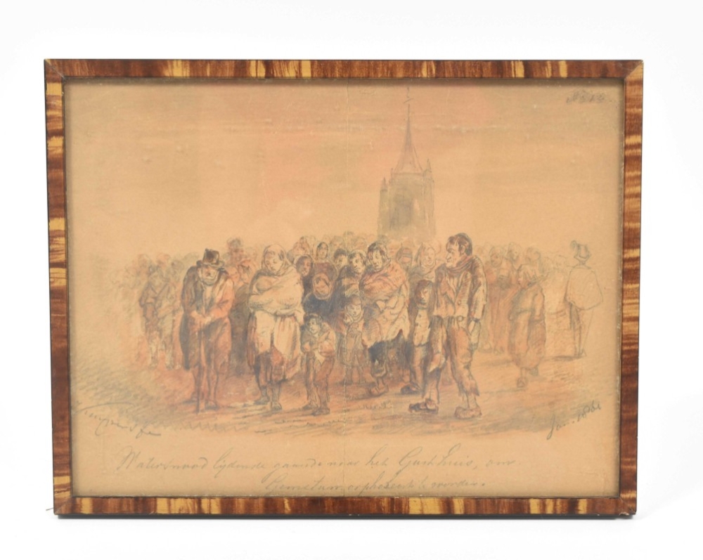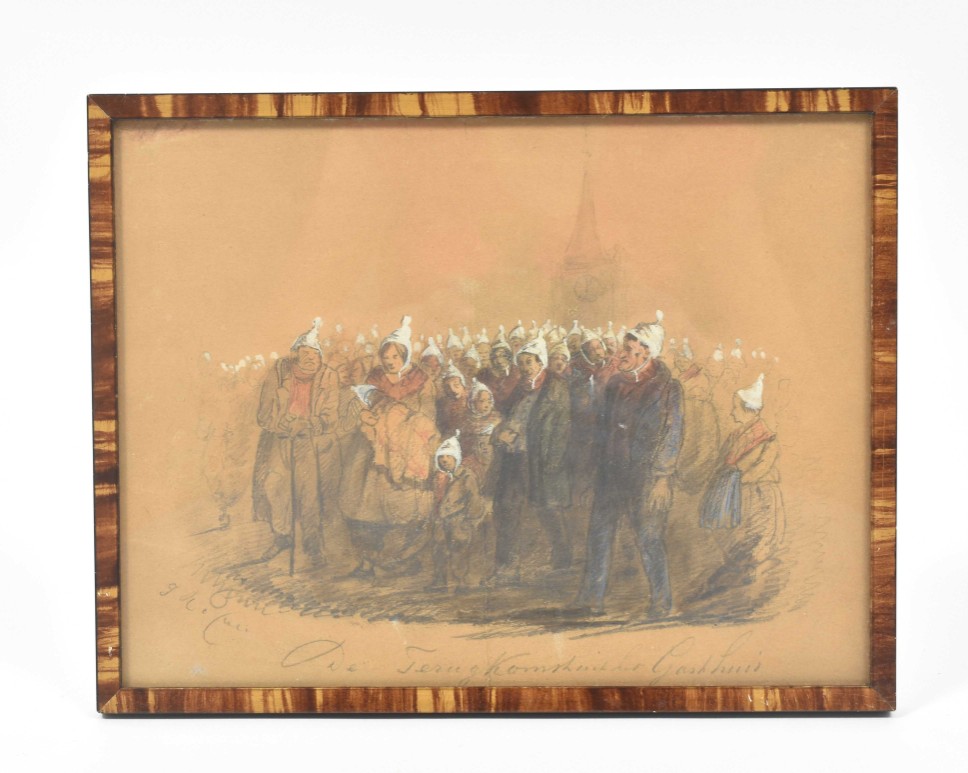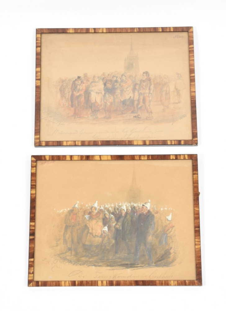 Both drawings browned or on brownish paper (not examined outside the frame); both w. central vertical fold. Interesting documentation of victims of the devastating floods of 1861, here with the church-tower of Gorinchem (the artist was active there from 1849 to 1878) vaguely in the background in both drawings. Apparently, after the floods the victims went to the "Gasthuis" to receive some kind of government or church-aid, and indeed, on their way back all of them are wearing white caps against the cold. (total 2)