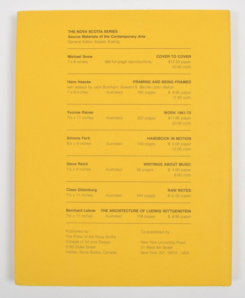 New York/Halifax, The Press of the Nova Scotia College of Art and Design/ New York University Press, 1975. Bright yellow dust jacket with black lettering. 28 x 22 cm, 229 pp.