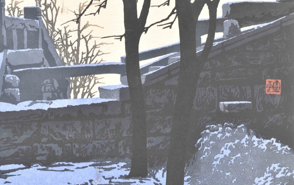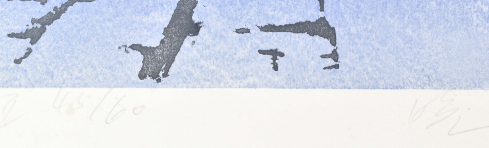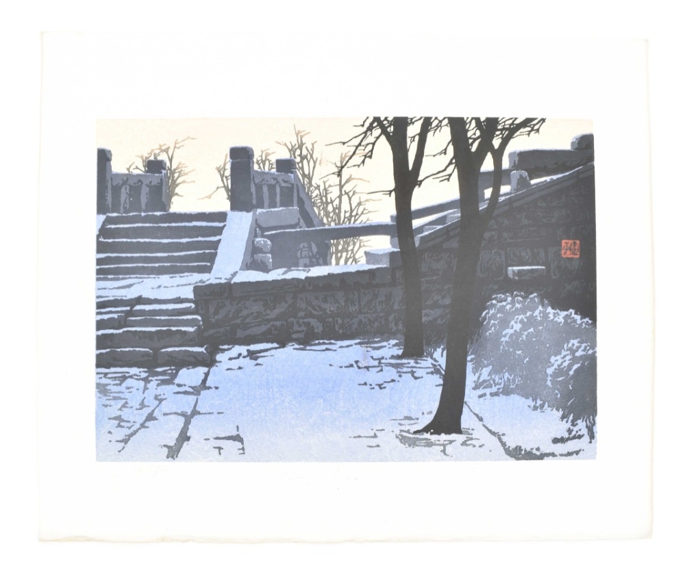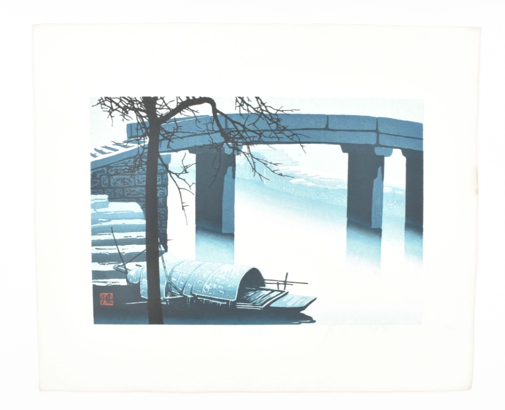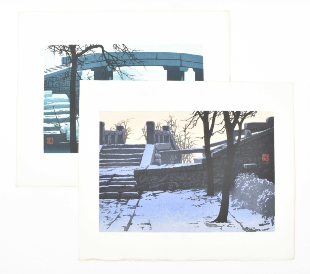 (1)"Bridge with boat in a canal". Sheet size 60 x 50 cm. Signed, titled, no. 56/80 and dated '99, partly in Chinese, with artist seal in red. (2) "Streets with snow". Sheet size 60 x 50 cm. Signed, titled, no. 45/60 and dated '98, partly in Chinese, with artist seal in red. Lower edge of sheet sl. frayed.