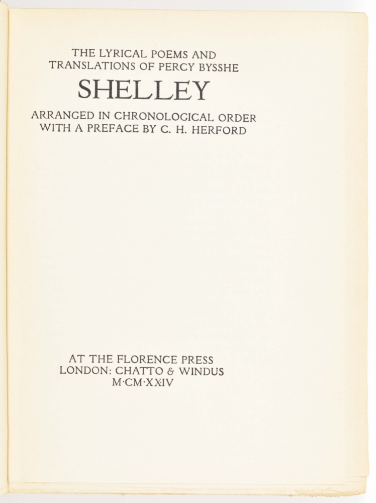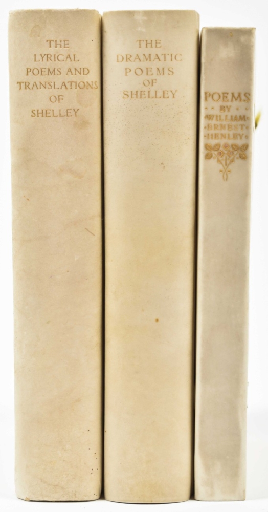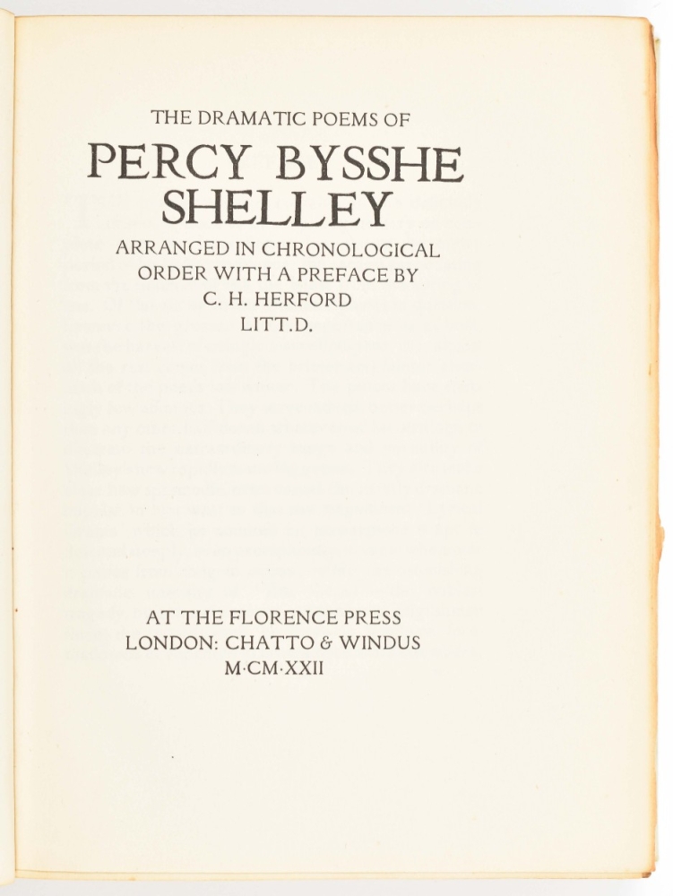 (2) Percy Bysshe Shelley. The Dramatic Poems. Arranged in chronological order w. a preface by C.H. Herford. London, Florence Press/ Chatto & Windus, 1922. XI,(1),412,(1) p. Orig. gilt-lettered full vellum, t.e.g., printed on handmade paper w. former owner's entry in pen on htitle. Deluxe untrimmed copy. -and 1 other vol. w. the lyrical poems and transl. by Shelley. Chatto & Windus, 1924. Deluxe copy w. full vellum gilt-lettered binding printed on handmade paper. (total 3)