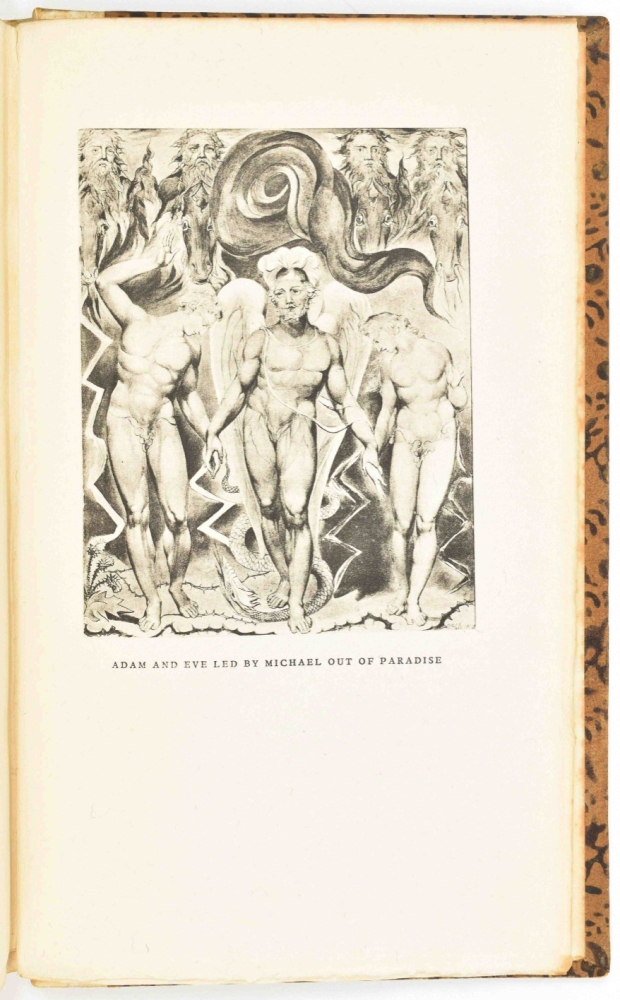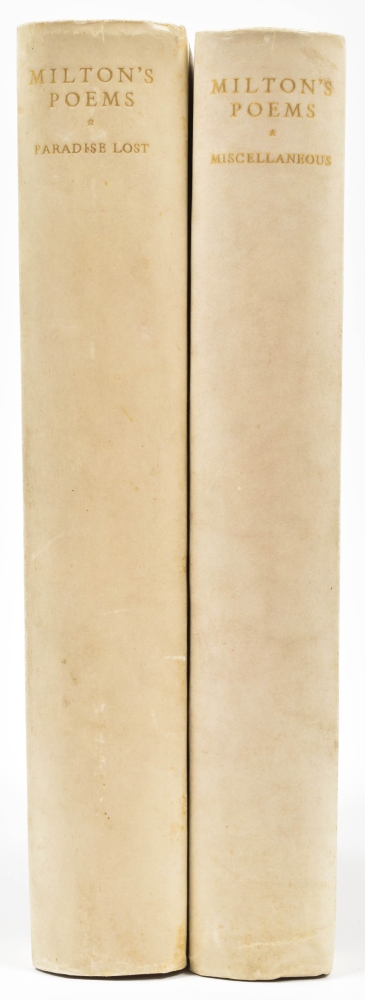 With ills. by William Blake. Vol. 1 Paradise Lost. Vol. 2 Miscellaneous Poems, Paradise Regain'd & Samson Agonistes. London, Nonesuch Press, 1926. (8),359; (4),283 p. 4to. Orig. unif. gilt-lettered hvellum, vol. 1 one of 1540 copies, vol. 1 unnumb., vol. 2 no. 450 of 1450 copies, bookplate of Vloemans on upper pastedowns, w. 15 (vol. 1) and 12 (vol. 2) plates by Blake.