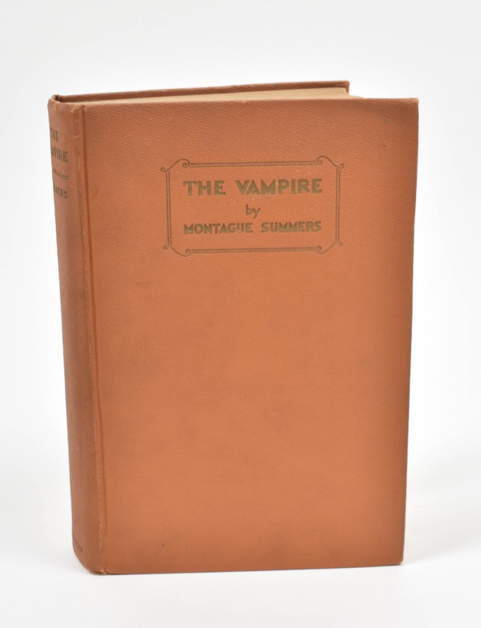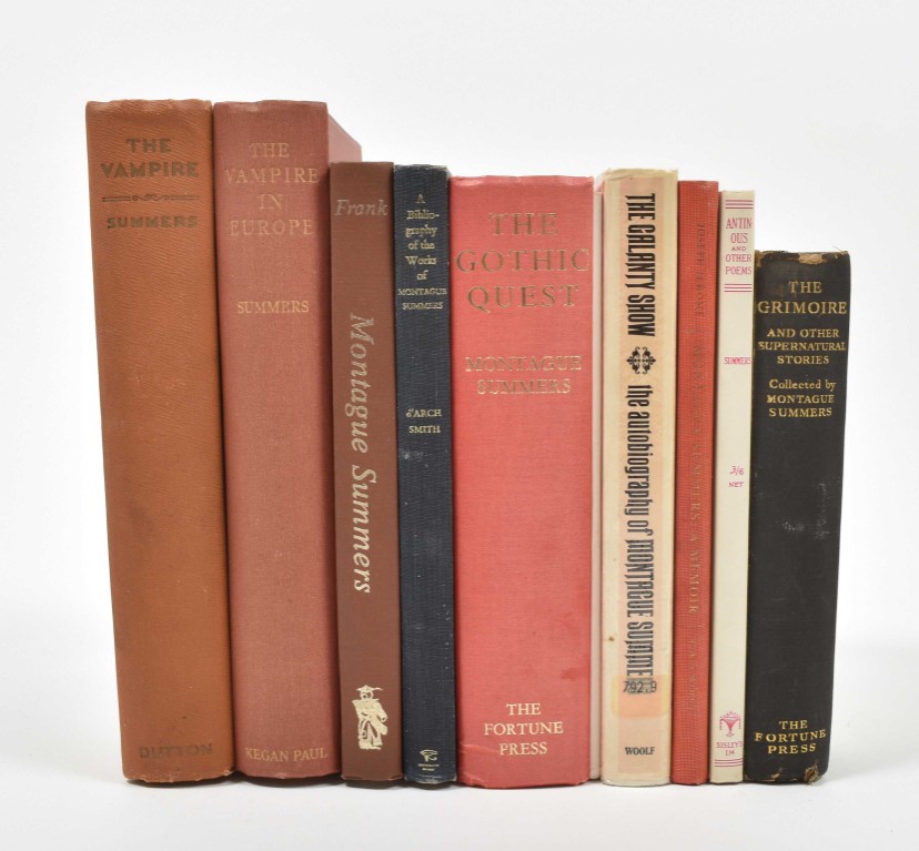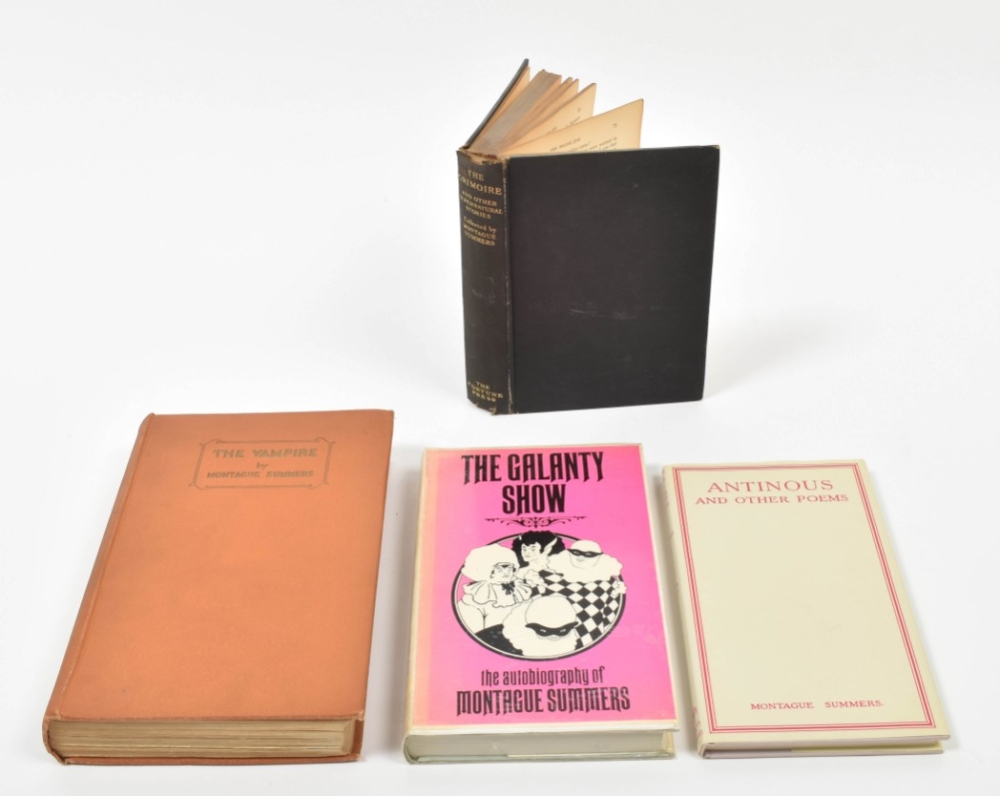 (2) The Galanty Show. The Autobiography of Montague Summers. London, C. Woolf, 1980. Dust-j. (3) The Vampire. His Kith and Kin. New York, Dutton, 1929. 1st US ed. (4) The Grimoire and other Supernatural Stories. Collected by M. Summers. London, Fortune Press, 1932. 1st ed. Stories by a.o.: Polidori; LeFanu; Maturin; and Summers himself. (5) Montague Summers: A Memoir by Joseph Jerome. London, 1965. Lim. ed of 750 numb. copies. -and 5 more. All cl. except 1, most w. bookplate on inner cover. Fair to good condition. (total 10)