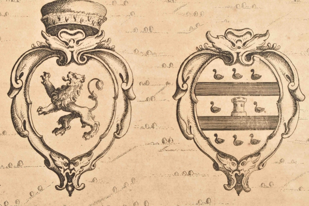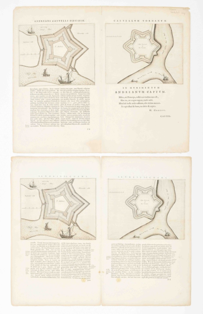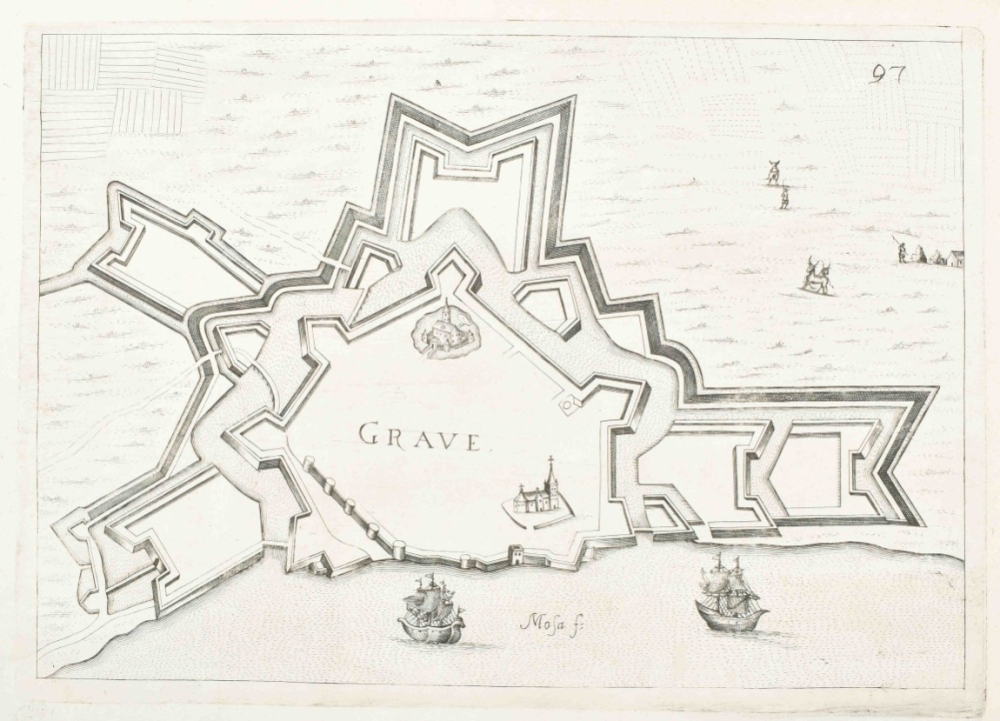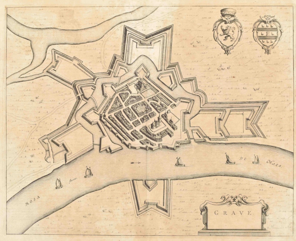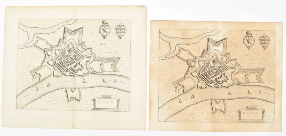 (2) Plan Grave w. fortifications and Coats of Arms. 42 x 53 cm. Copper engr., verso Latin text. (3) Another plan. Idem. Paper browned. (4) Fort. plan Grave. Frankfurt, G.G. Priorato, 1683. -and 2 Blaeu lvs. w. fortifications.(total 6)
