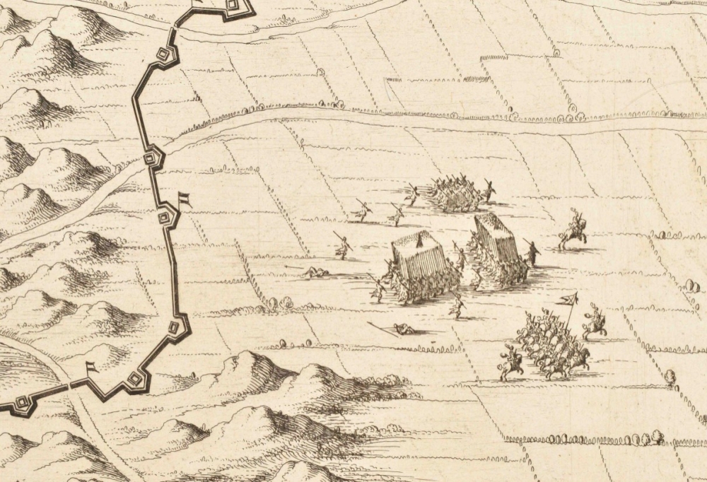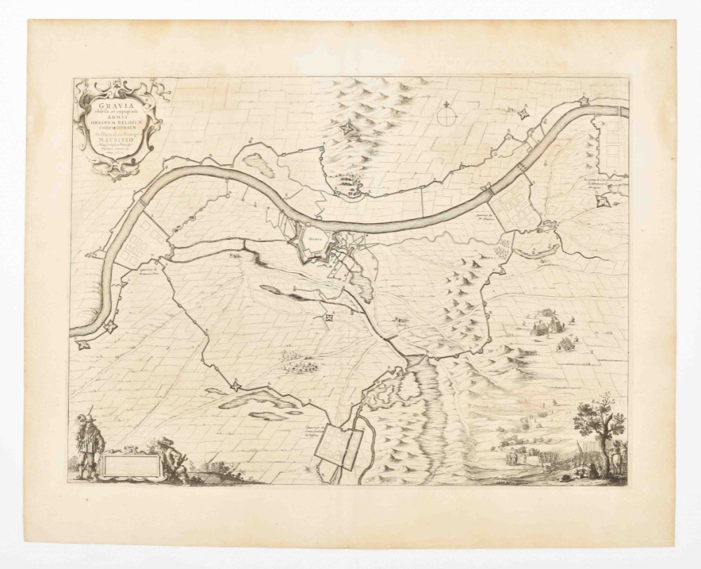 et Expugnata Armis Ord. Belg. Conf. Ab Illustrissimo Principe Mauritio. 1602. Amst., Joan Blaeu, 1649. 39 x 53 cm. Copper engr., title in cartouche, text verso in Latin. Siege and fortifications w. other defensive works around Grave.