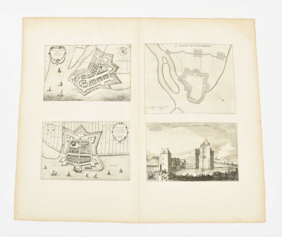 (2) and (3) 2 more of the same w. Latin text. Added: a double leaf from Blaeu's "Stedenboek" w. a plan of Geertruidenberg, fortifications of the same, a plan of Woudrichem and a view of the "Huys te Lovensteyn". (total 4)