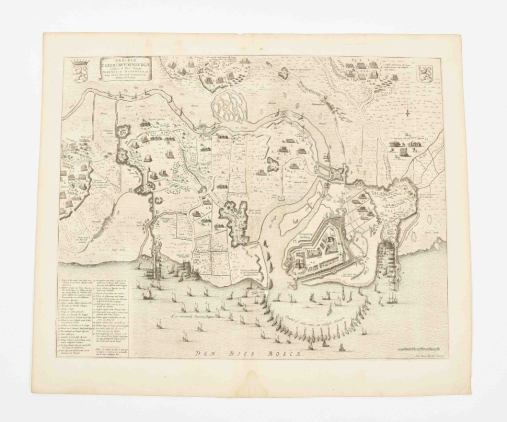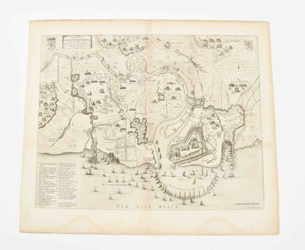 St. Geertruydenbergae confecta ab illustr. Principe Mauritio Nassovio (...) anno 1595 taken from Blaeu's "Stedenboek". Amst., 1649. 45 x 57 cm. Copper engr. by Baptist Boazis, signed on the plate, cartouche w. title, coats of arms and legenda, verso Dutch text. The siege was carried out by 3 Spanish armies coming from Waspik, Oosterhout and Den Hout under command of the Count of Mansfeld.