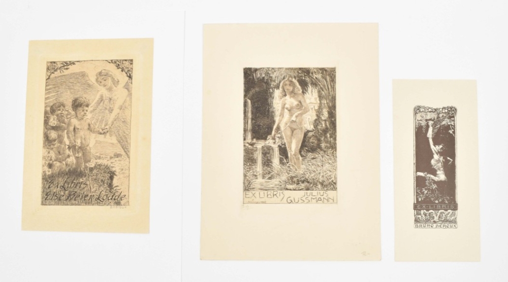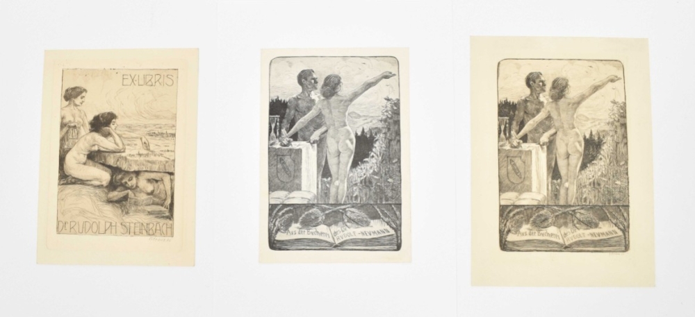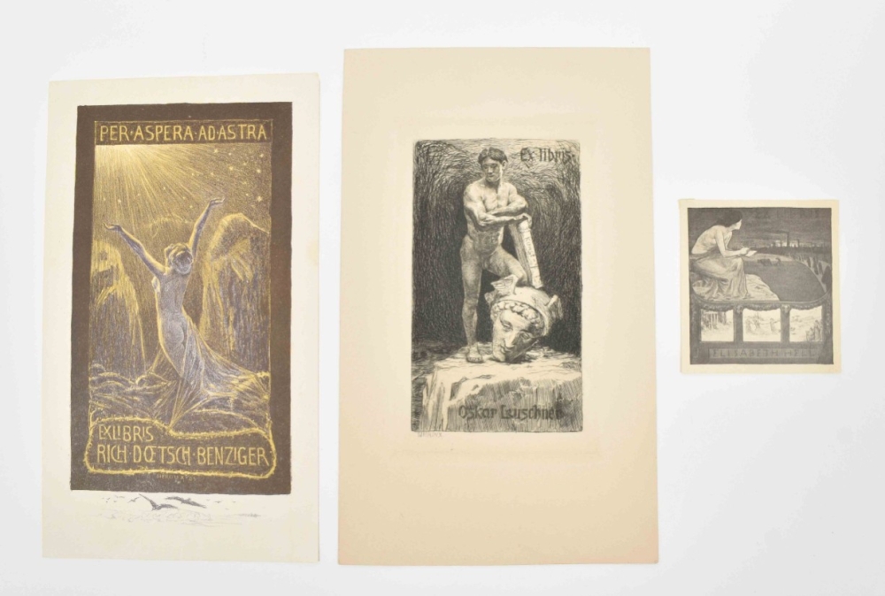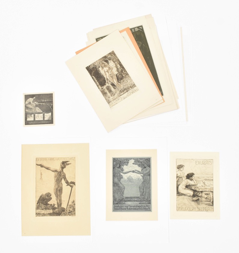 A few w. remnants of former mount verso. Fine collection of skillfully produced ex libris, for a.o.: Siegemund Lehnsman; F. Pflüger; Simon Kurz; Julius Gussmann; Hans Harrassowitz; Johannes Haupt; Oskar Leuschner; Rudolf Neumann; and Gerda Lieven. (total 26)