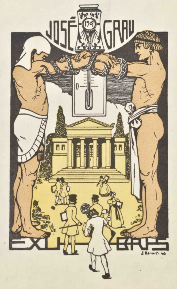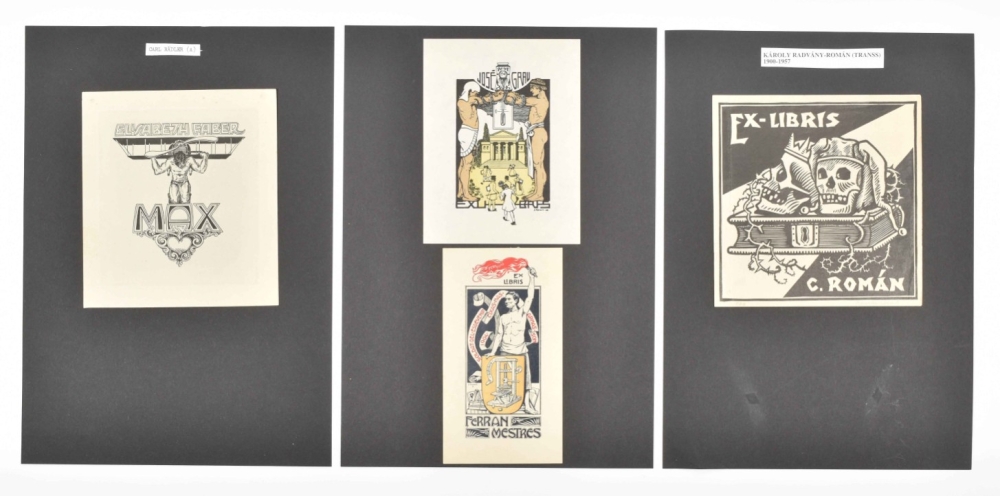 Comprised of ex libris for a.o.: Mateo Cullel Aznar; Saturnino Calleja; José Grau; and members of the family Monsalvatje. -and (loosely inserted in the same binder) approx. 60 miscell. ex libris in various techniques and sizes by a.o.: Richard Preusse; M. Quarles van Ufford (for Victor van Vriesland); Károly Radvány-Román (9); Carl Rädler; A. von Rátsay; Fritz Rehm; Alexandre de Riquier (5); and Carl Ritter (7). (total approx. 80 in 1 binder)