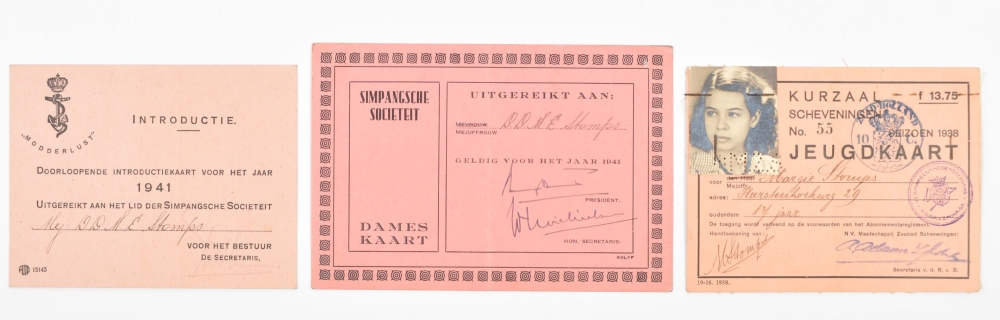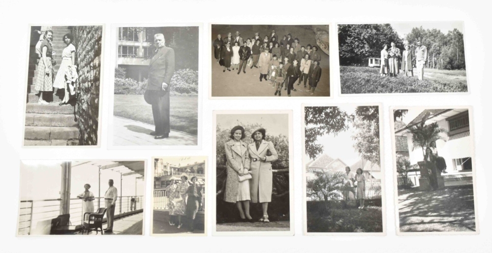 Ca. 1920-1955. Approx. 130 family photogr. in The Hague and Indonesia, also incl. a.o.: many street scenes and views; two ladies' entry cards for the colonial Simpang Club, 1941; a youth card w. portrait photo of the Kurzaal in The Hague, 1938; and a youth card for tennis park de Bataaf, 1955.