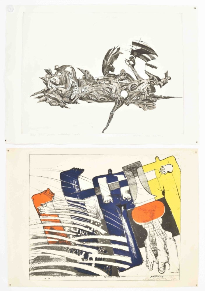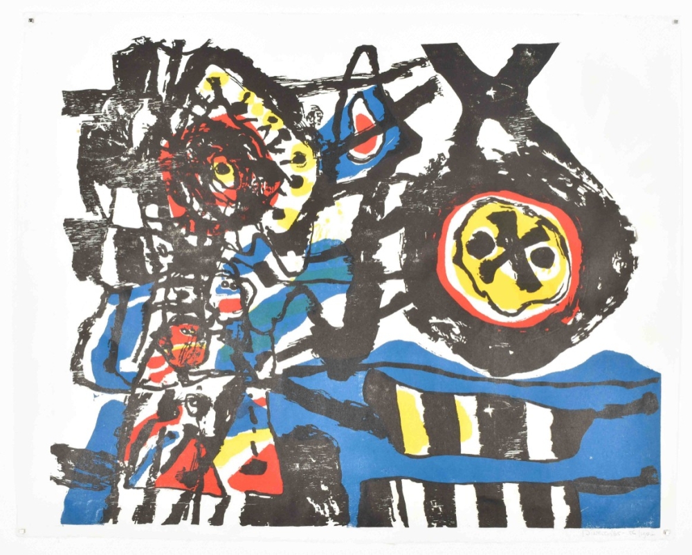 (2) J.G.M. ("Hannes") Postma (1933-2020). 'Twee armlengten'. Etching and col. aquatint, 49 x 70 cm, signed and numbered 56/190 in pencil and signed, titled and dated 'februari 1966' on reverse of the plate. -and 3 others from the Prent 190 series by Hannes Postma, Eduard Flor and Jef Diederen. Added: large etching by Hannes Postma. (total 6)
