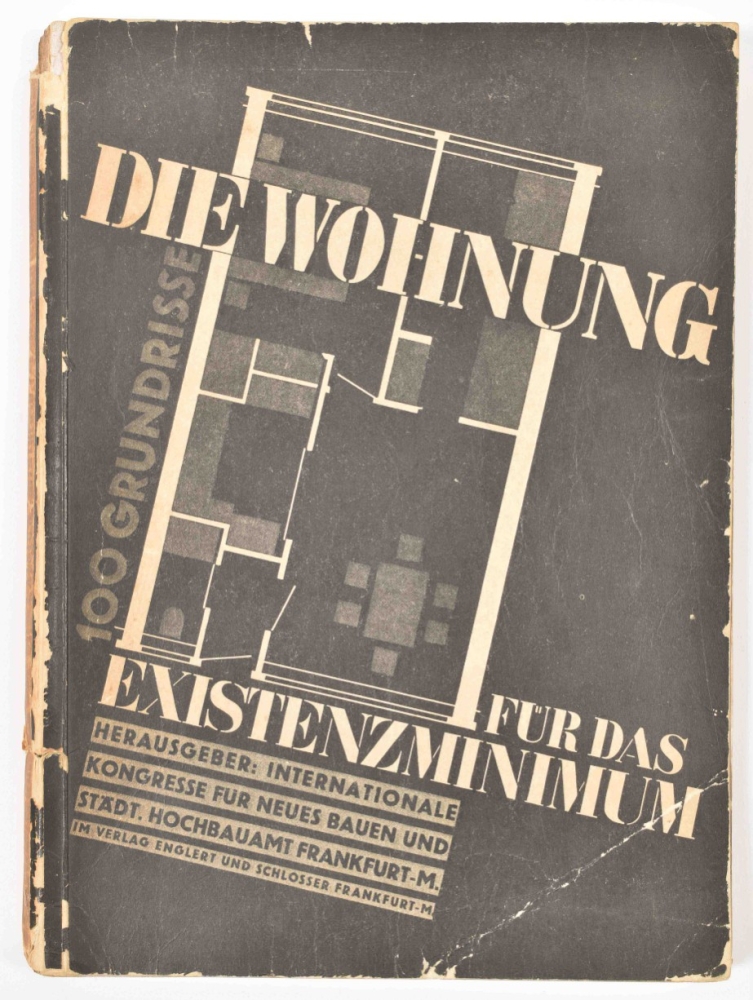 (...). Herausgeber: Internationale Kongresse für Neues Bauen und Städtisches Hochbauamt in Frankfurt am Main. Einhundert Grundrisse mit erklärenden Referaten von Victor Bourgeois (Brüssel), Le Corbusier und Pierre Jeanneret (Paris), Sigfried Gideon (Zürich), Walter Gropius (Berlin), Ernst May (Frankfurt-M) und Hans Schmidt (Basel). Frankf. a.M., Englert & Schlosser, 1930, 1st ed., 42, (4) ,207, (3), 15, (1) p., num. full-p. ills., orig. pict. wr., 4to.