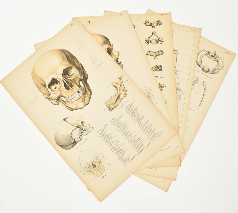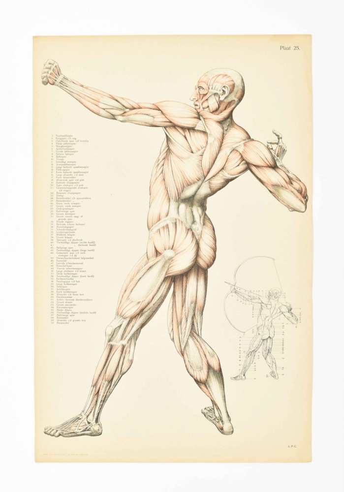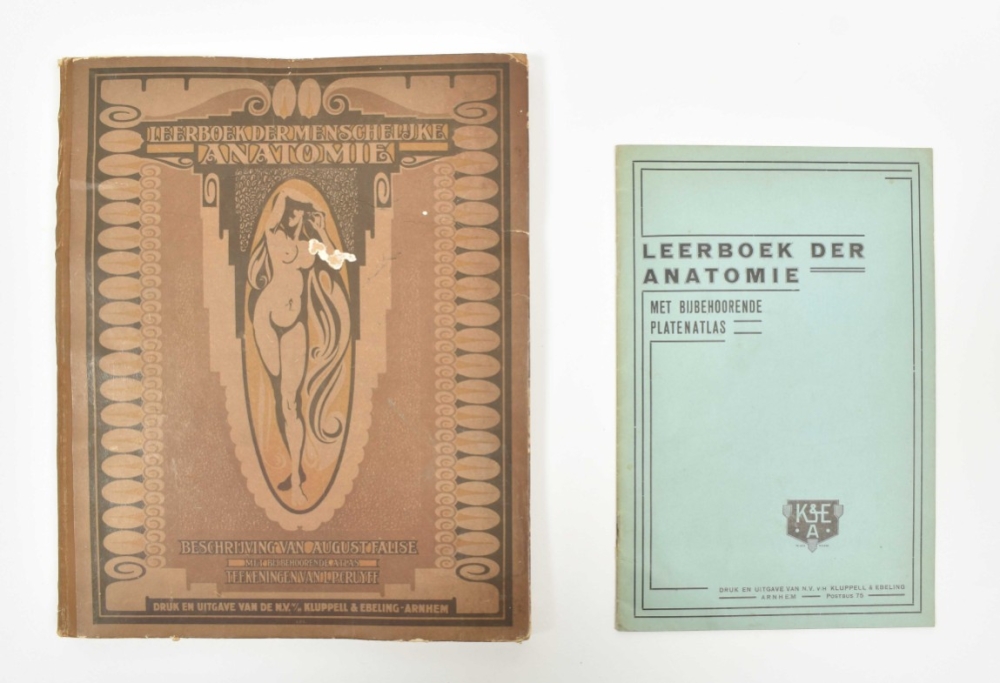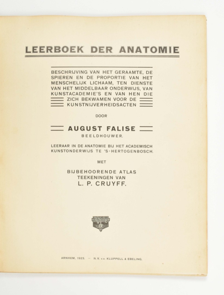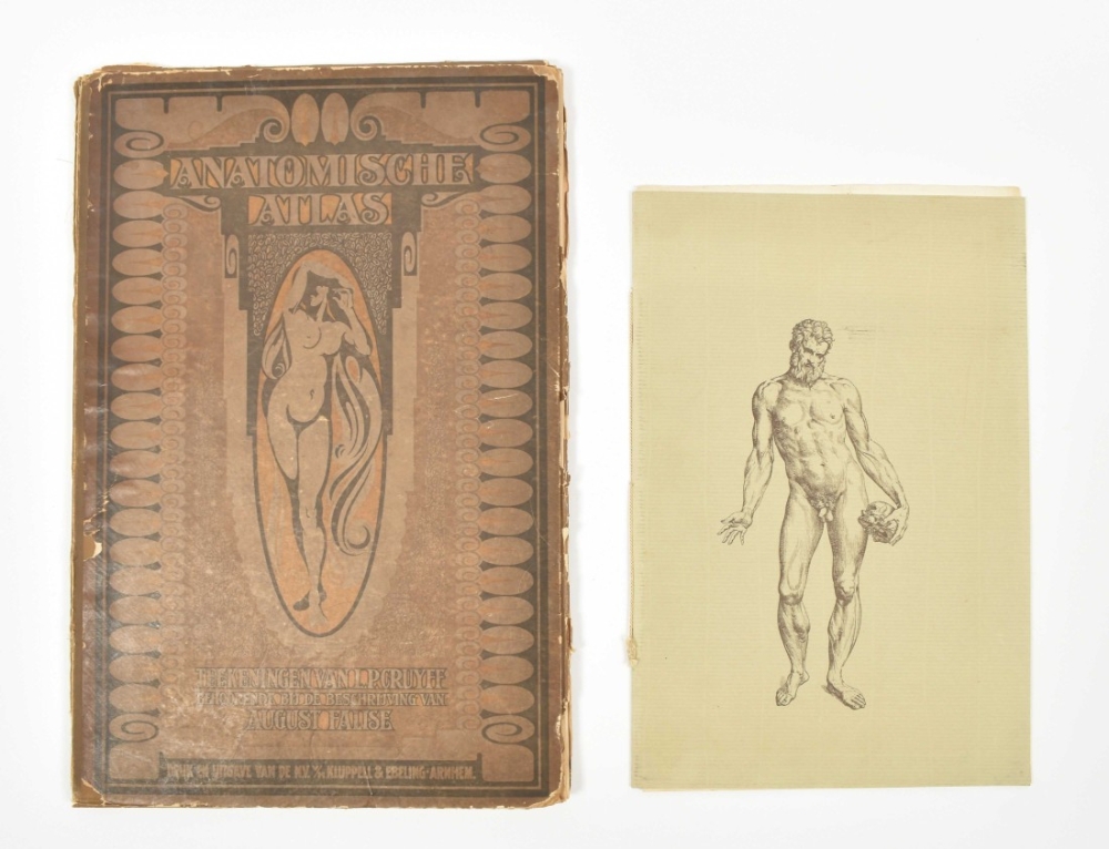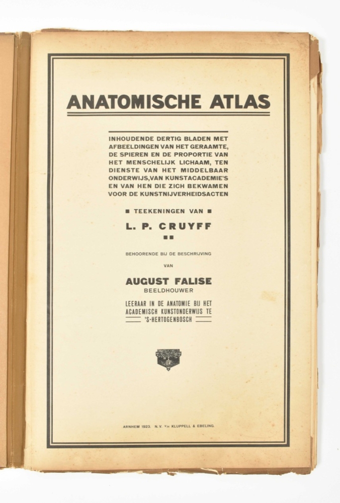 Beschrijving van het geraamte, de spieren en de proportie van het menschelijk lichaam, ten dienste van het middelbaar onderwijs, van kunstacademie's en van hen die zich bekwamen voor de kunstnijverheidsacten. Door August Falise, beeldhouwer. Leraar in de anatomie bij het academisch kunstonderwijus te 's-Hertogenbosch. Arnhem, N.V. v.h. Klupell & Ebeling, 1923, text vol. and atlas, text vol.: (4), 98, (2) p., ills., orig. clothbacked pict. boards, 4to; atlas: num. ills. on 30 titled lithogr. plates after L.P. Cruyff, loose as issued in orig. cl.-backed board portfolio unif. w. the text vol., folio.