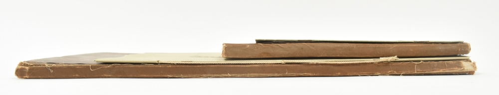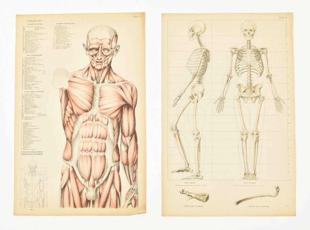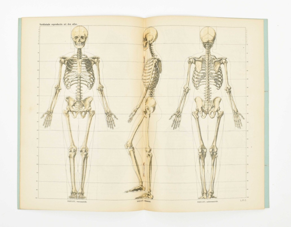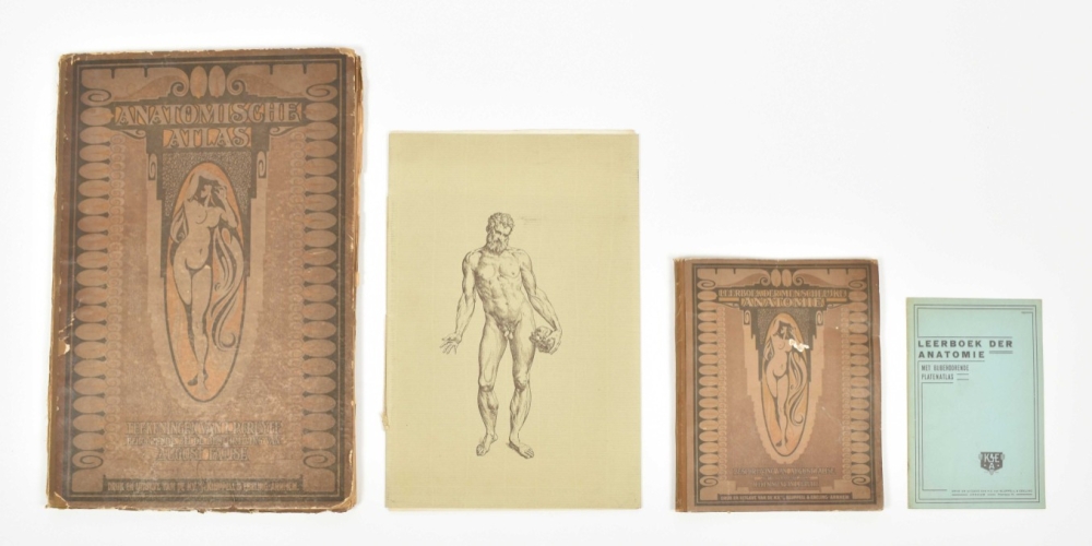 Rather poor copy: text vol. w. warped/ creased boards; the plates in the atlas waterst. in blank margins, the portfolio worn and sl. dam. Rare. With owner's entry "B. Jordens Amsterdam" on title-p. of text vol., perhaps the illustrator Bep Jordens (1903-1987). With loosely inserted prospectus for the work, issued in 1925. The book cost 20 guilders at the time. Also loosely inserted is a work on the anatomist and physician Andreas Vesalius (1514-1564). (total 4)
