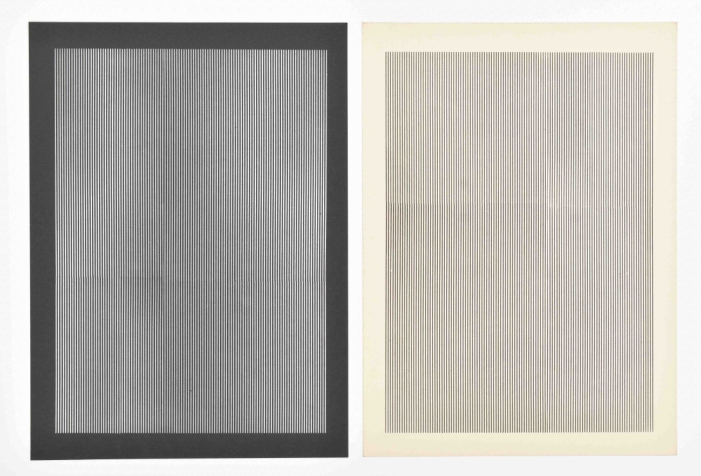 Rare exhibition catalogue containing 3 original silkscreens, one printed b/w on transparent plexiglass sheet, one printed b/w cardboard, another printed white on black cardboard. Each 32 x 23.5 cm displaying striped patterns causing an intense optical effect of flickering.