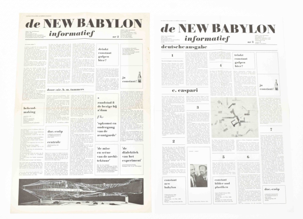 Rare complete set of the periodical published in conjunction with four different exhibitions by Constant (1920-2005). Newspaper type sheet, 52.5 x 34 cm, folded twice. Includes: No.1 July 1965 published by Stichting Artishock, for New Babylon at the Dominicanerkerk Maastricht. (2) No.2, October 1965, published by Anarchitectura for Constant | schilderijen plastieken New Babylon at Gemeentemuseum The Hague, edited by Victor Nieuwenhuys.