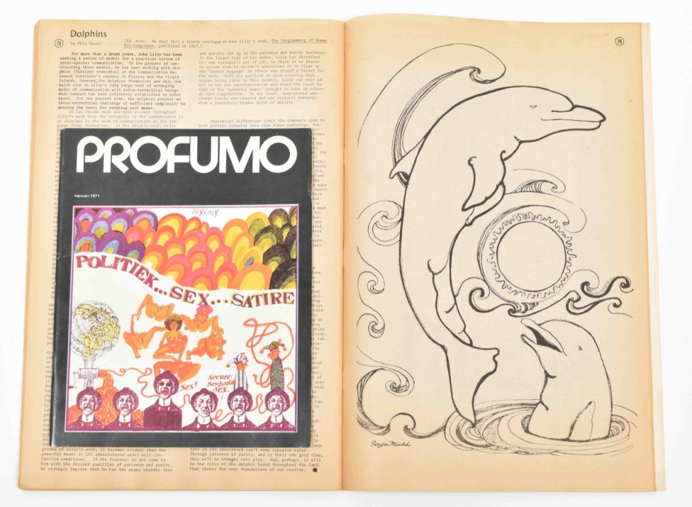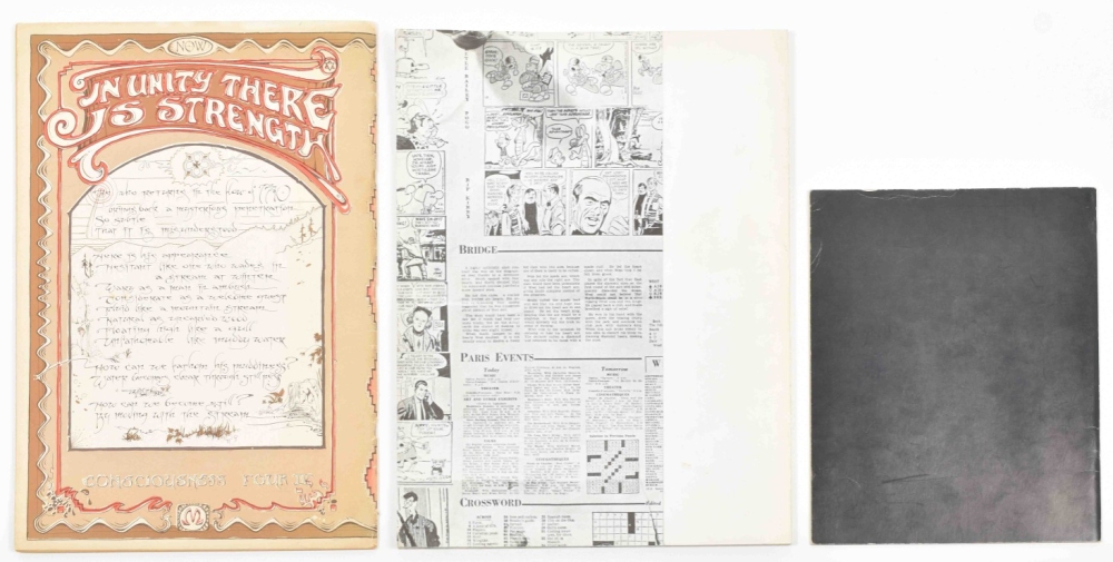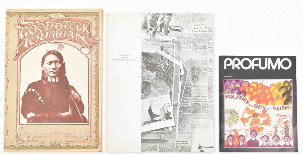 (2) The Woodstock Aquarian Vol.2, No.1. 1971. Edited by Allen Gordon. 42.5 x 28 cm, 96 pp. Sewn, ill. wrappers creased with small torn piece at right margin, interior fine. (3) Profumo, February 1971, 28.5 x 23 cm, 40 pp. Dutch magazine on politics, sex and satire. Very good copy. (total 3)