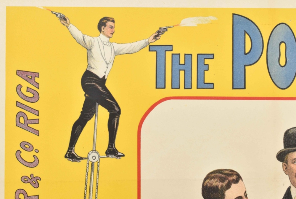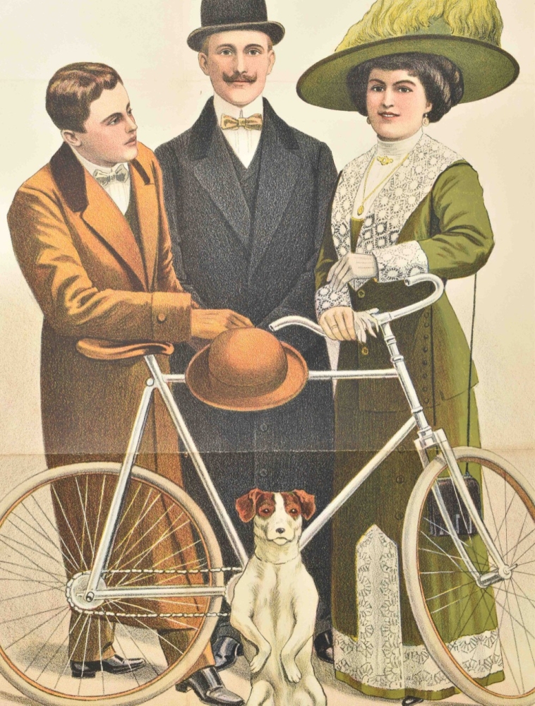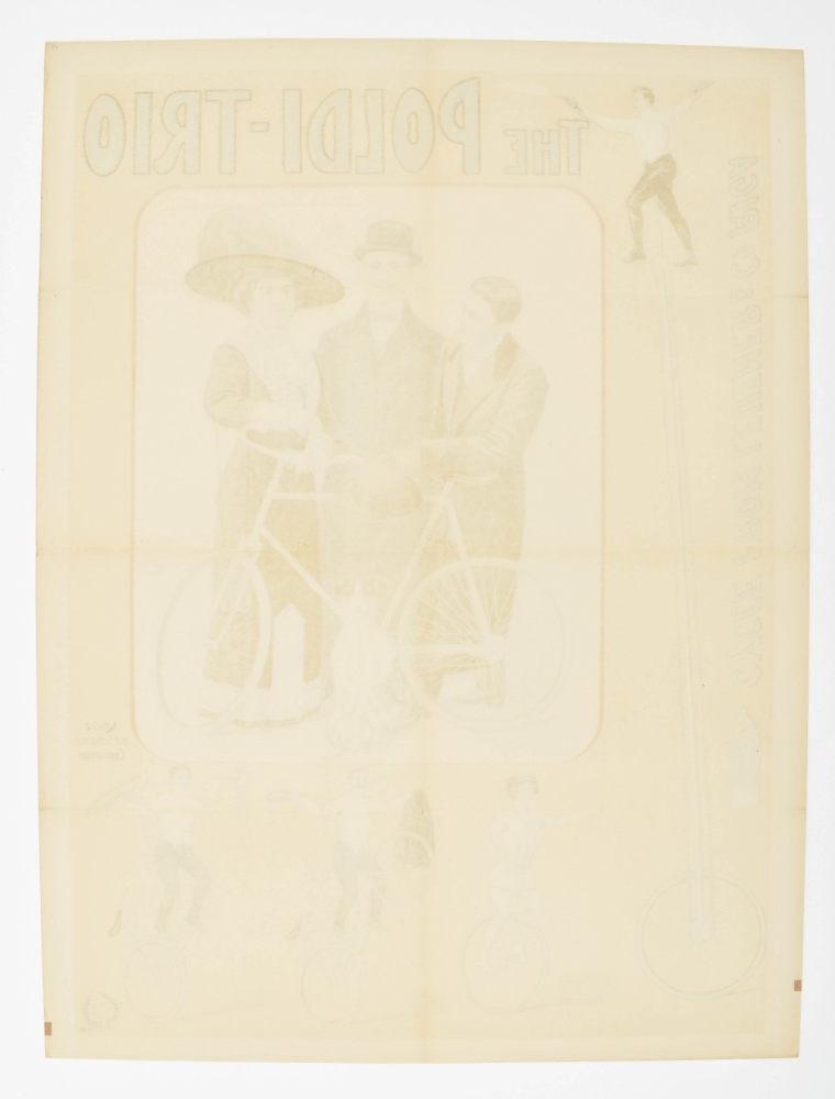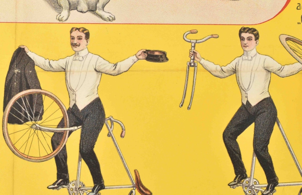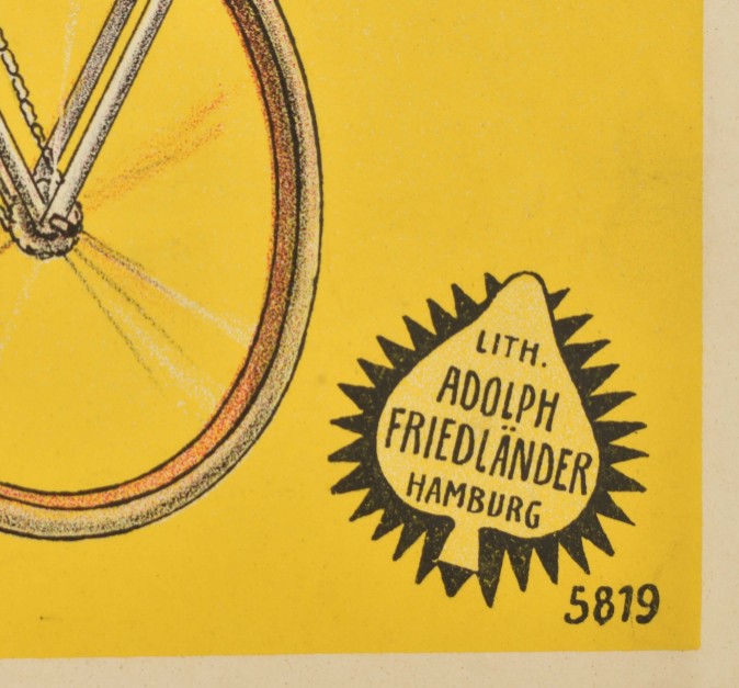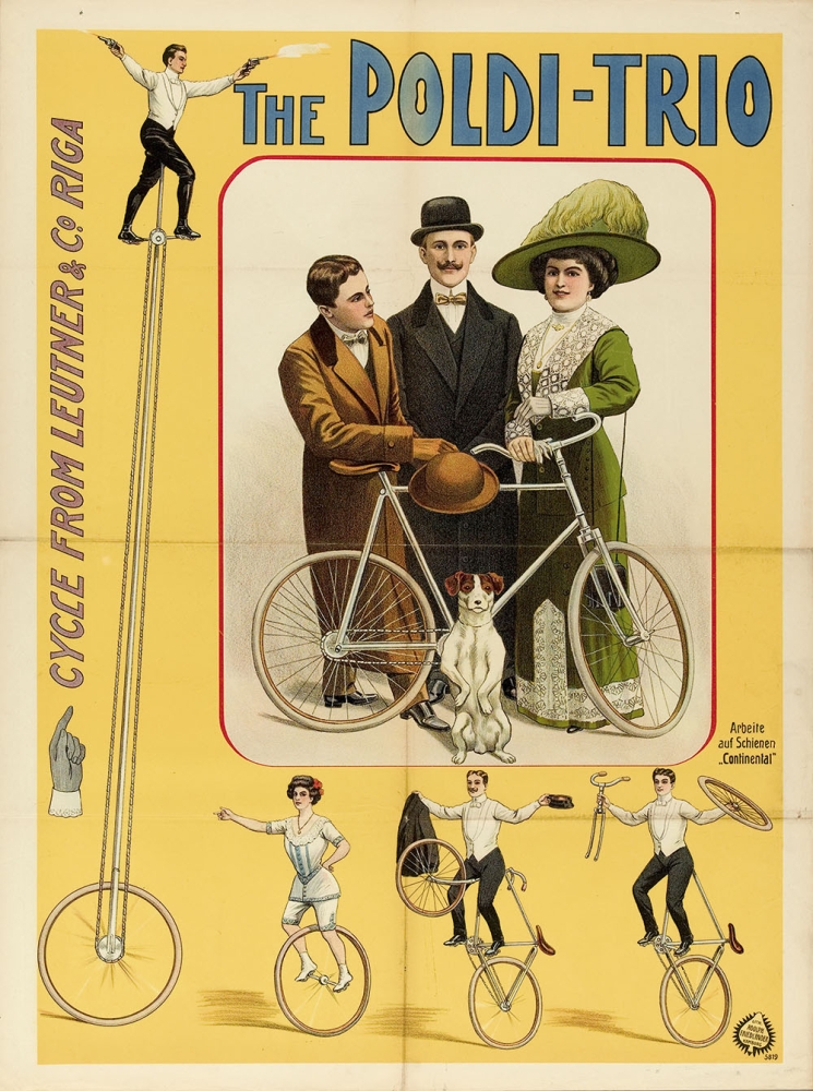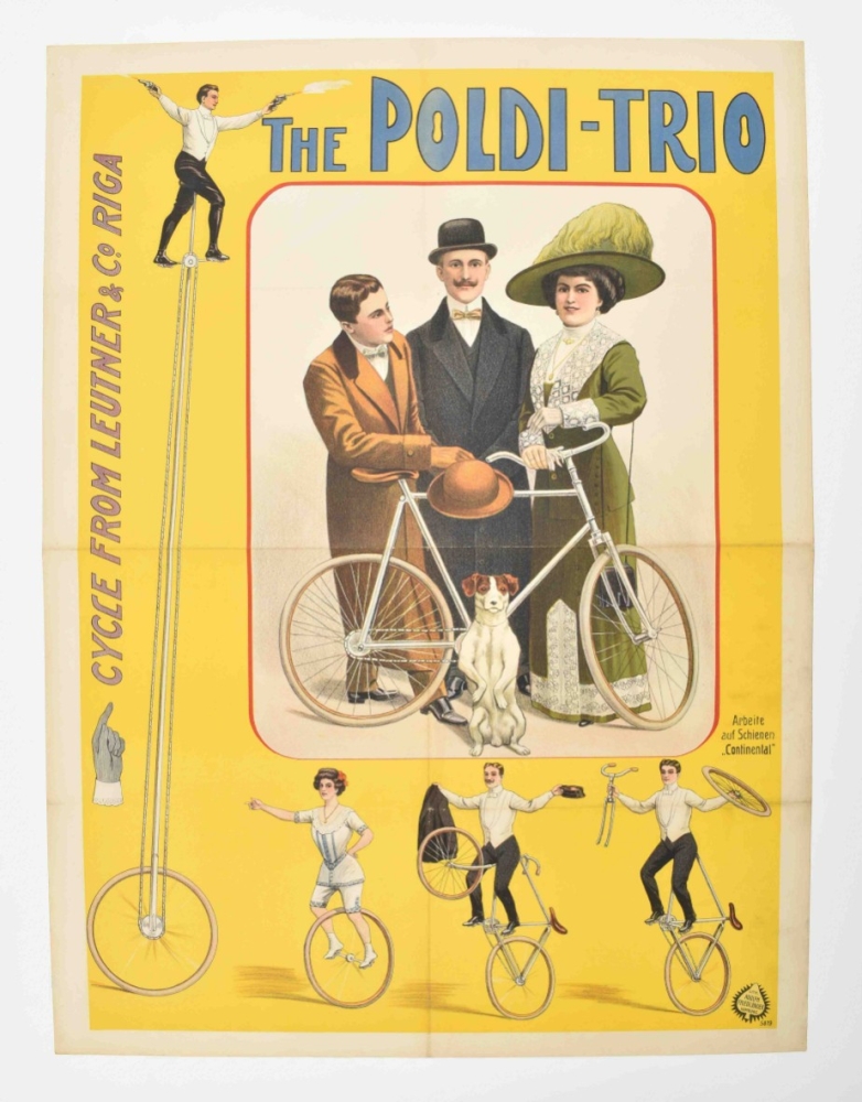 With a design of a very high unicycle by Leutner & Co. from Riga, the first and largest bicycle and motorcycle company in the Russian Empire. Friedländer, Hamburg, 1913. 96 x 71 cm. Lith. no. 5819.