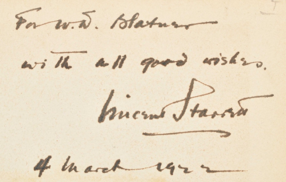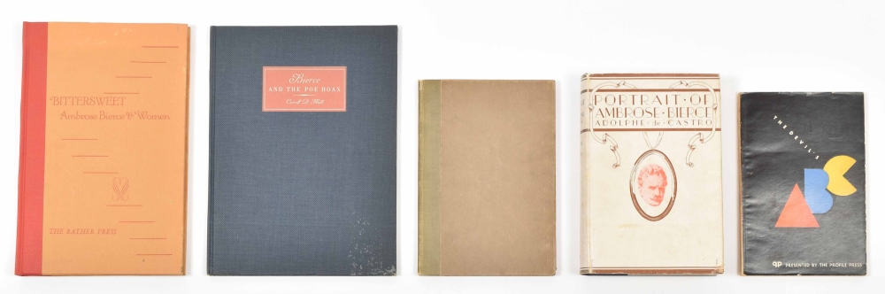 (2) Vincent Starrett. Ambrose Bierce. Chicago, Walter M. Hill, 1920. 1st ed. Printed in 250 numb. copies, w. dedication by Starrett, hcl. (3) Caroll D. Hall. Bierce and the Poe Hoax. San Francisco Book Club, 1934. 250 numb. copies, cl. (4) The Devil's ABC. A Selection from Bierce's The Devil's Dictionary. New York, Profile Press, 1946. Sc, ill. Rare. (5) Lois Rather. Bittersweet: Ambrose Bierce and Women. Oakland, The Rather Press, 1975. Hand printed by the author in lim. ed. of 150 copies, hcl., ill. -and 13 more by and about Bierce, incl. ephemera. Most 8vo, w. bookplate. Overall in good condition. (total 18)