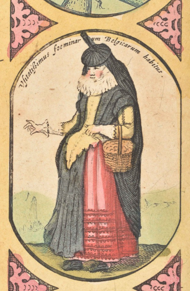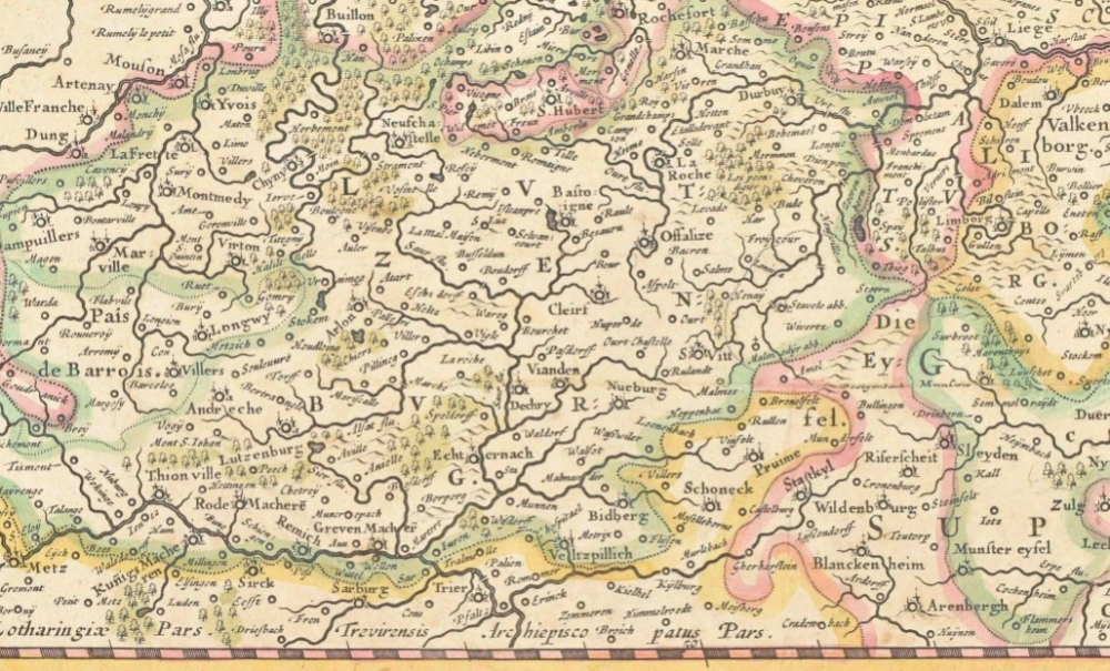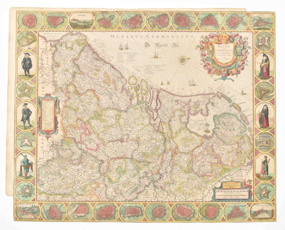 Accuratissima Tabula. Amst., 1631. 48 x 60 cm. Col., fold. as publ., ill. borders, upper and lower sides w. towns and views in ovals, left and right sides w. people in ovals, fortifications in round medallions, large cartouche w. title, 17 coats of arms, legenda and scales.