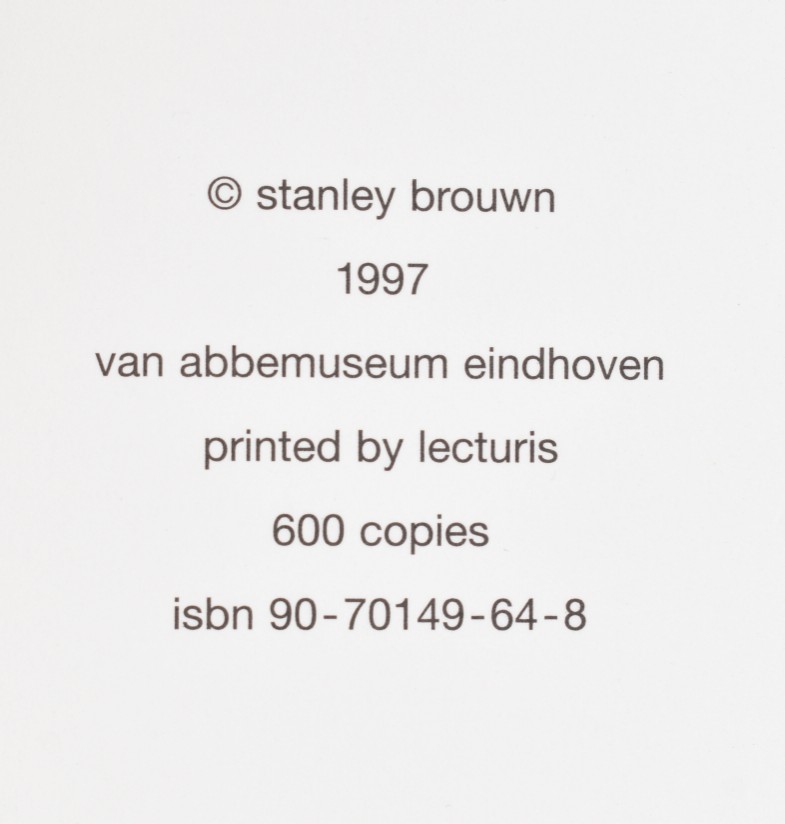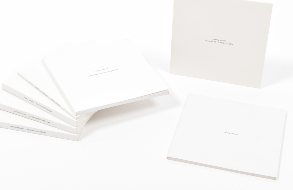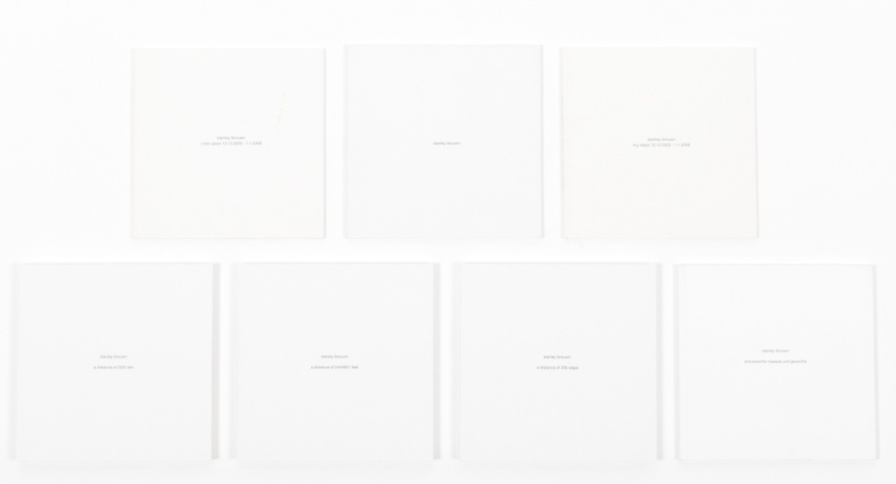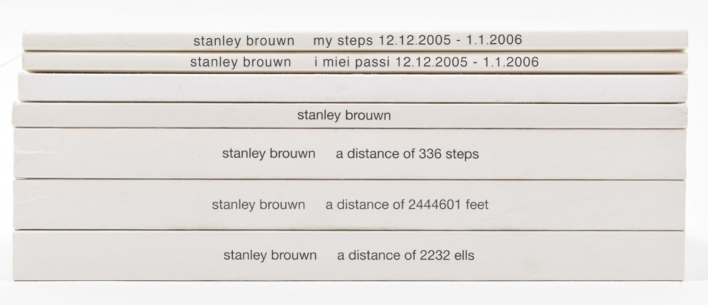 published between 1997-2015. All printed the same size, 15.5 x 15.5 cm, on white stock with signature lettering. Includes (1) stanley brouwn. Van Abbemuseum Eindhoven, 1997. Edition of 600, printed by Lecturis. (2) Three booklets published in 2000 by the Netherlands Foundation of Visual Arts, Design and Architecture on the occasion of the oeuvre award presented to Brouwn. Edition of 700, printed by Lecturis. Includes: a distance of 2232 ells, a distance of 2444601 feet and a distance of 336 steps.