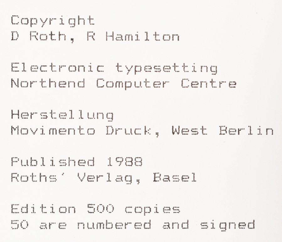 Basel, Roths' Verlag, 1989. Collaborative artists' book by Dieter Roth and Richard Hamilton printed in two joined volumes and housed in a rubber stamped cardboard slipcase. Sewnbound book, 17 x 11.1 cm, 128 pp. Slipcase, 17.7 x 11.3 cm.