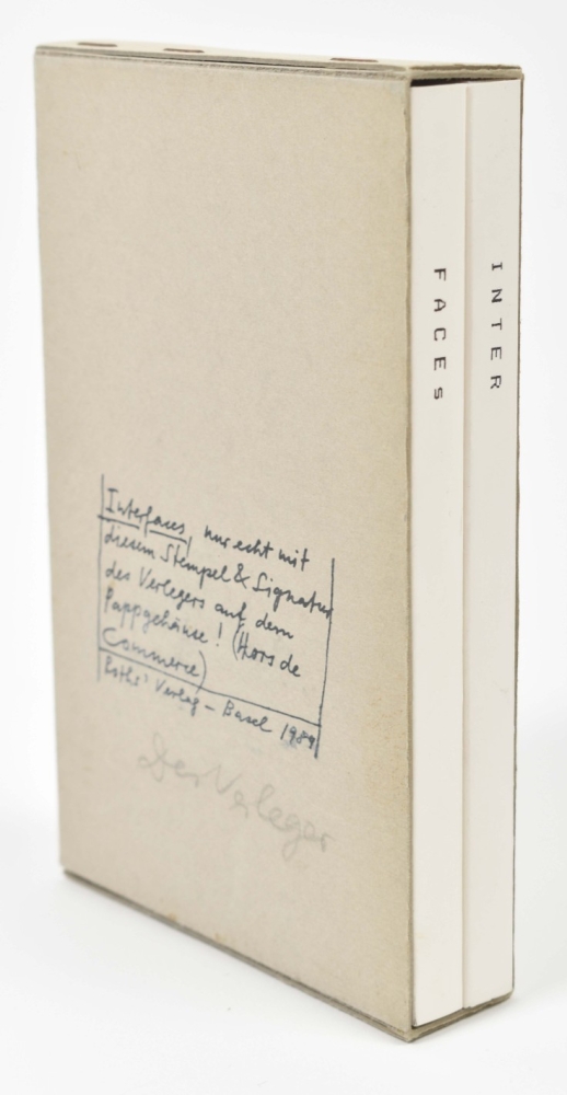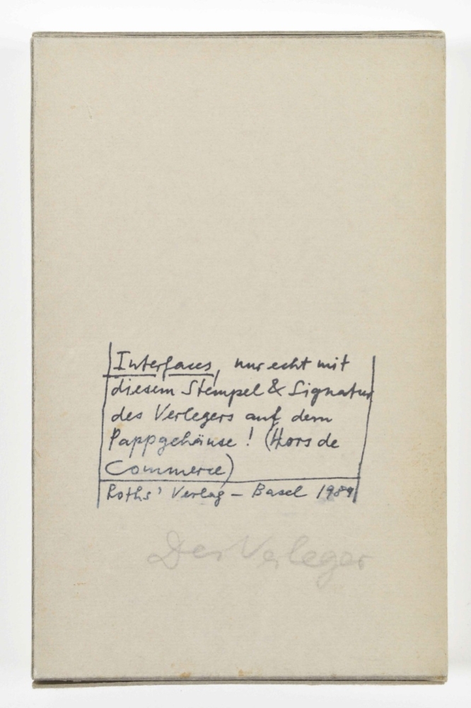 The original edition size was 500, with 50 signed and numbered copies, but a major part was destroyed due to bookbinding defects. Eventually only a few copies were distributed mostly among friends of the artists. This is a rare hors de commerce copy, signed on the slipcase in pencil ‘Der Verleger’ (the publisher, aka Dieter Roth)’, and stamped with the authenticating text: 'Interfaces, nur echt mit diesem Stempel & Signatur des Verlegers auf dem Pappgehäuse! Hors de Commerce.’ Very good copy.