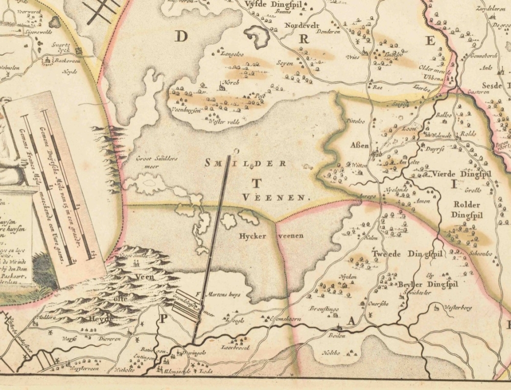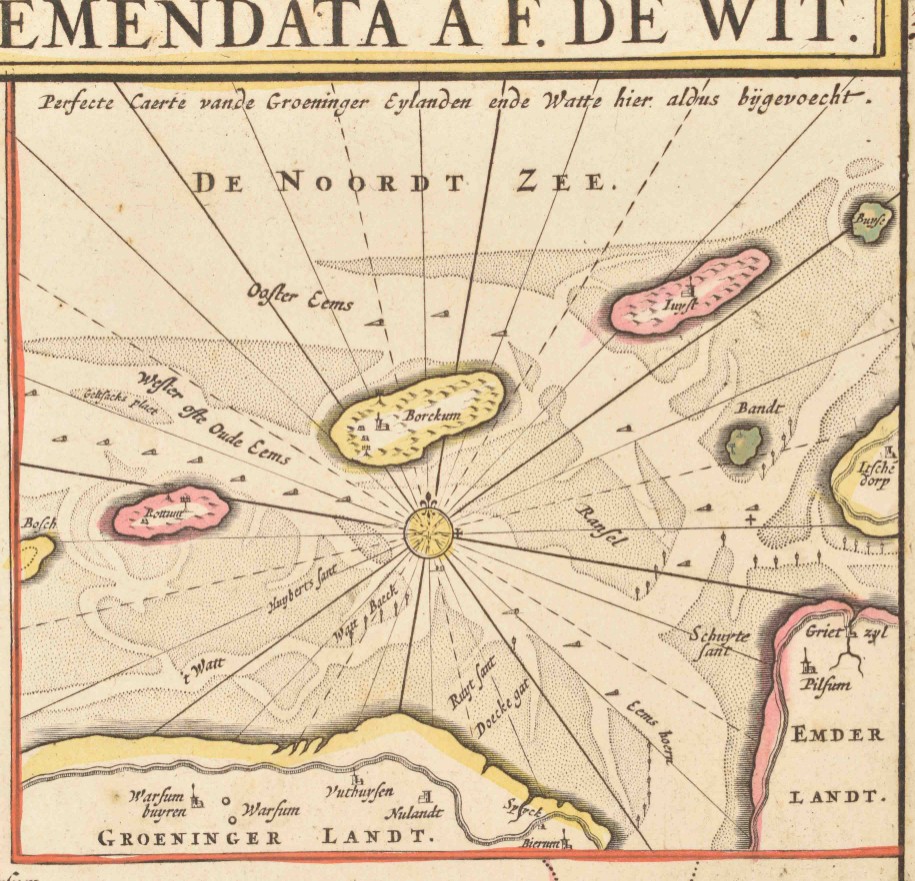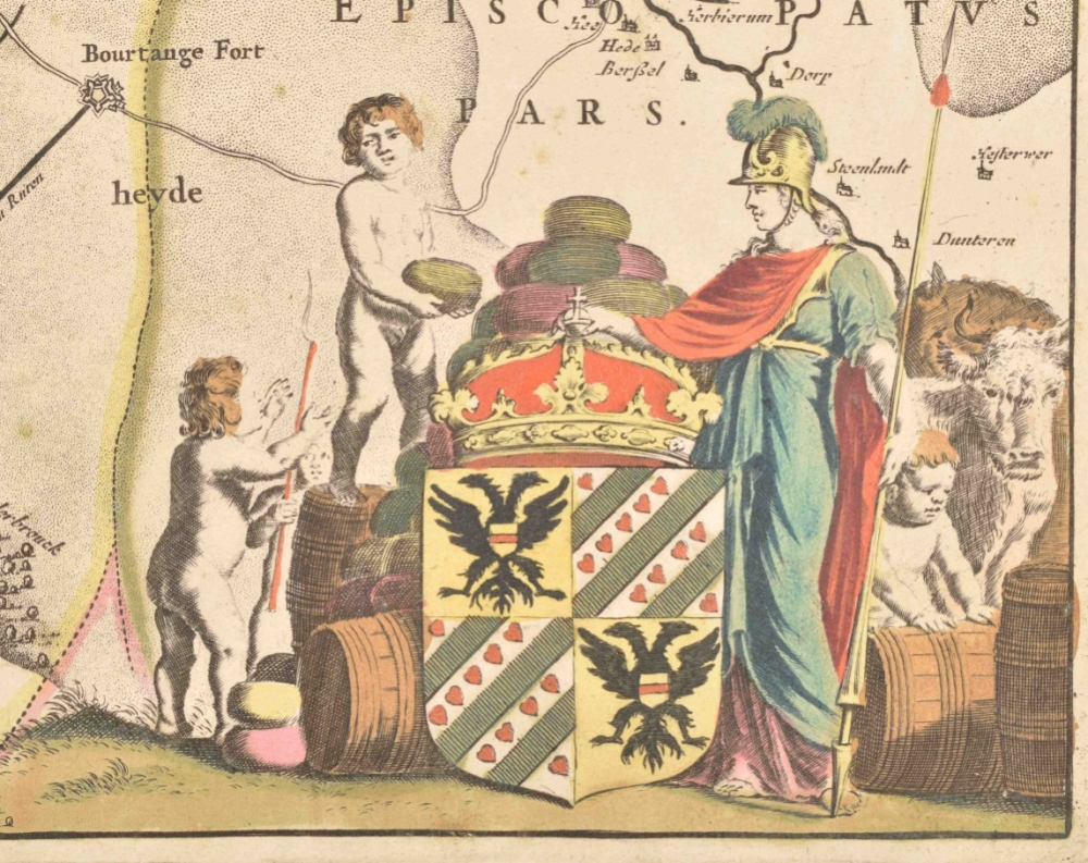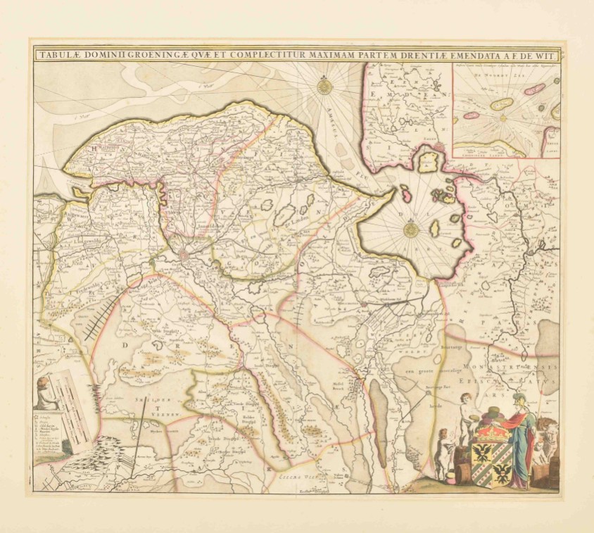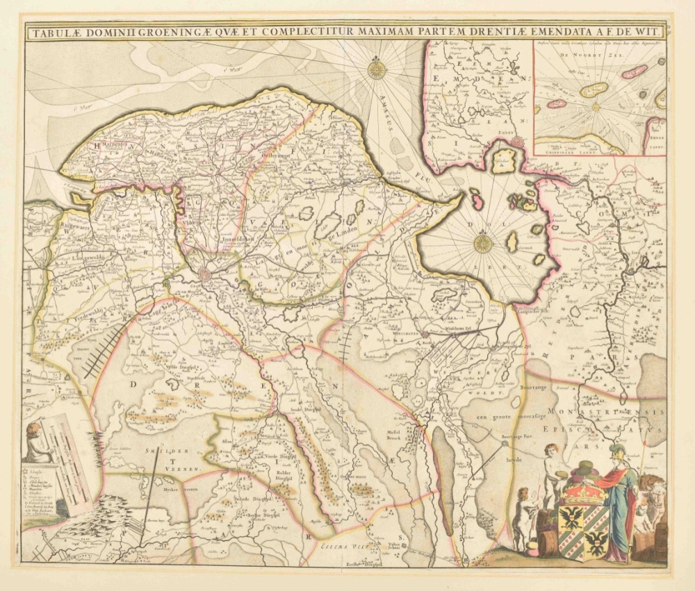 Quae et complectitur maximam partem Drentiae emendata a F. de Wit. Amst., ca. 1690. 47 x 55 cm. Outline and cartouche col., w. coat of arms, scales and inset map (10 x 11 cm) of Wadden. In passe-partout.