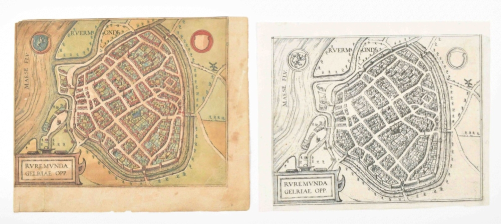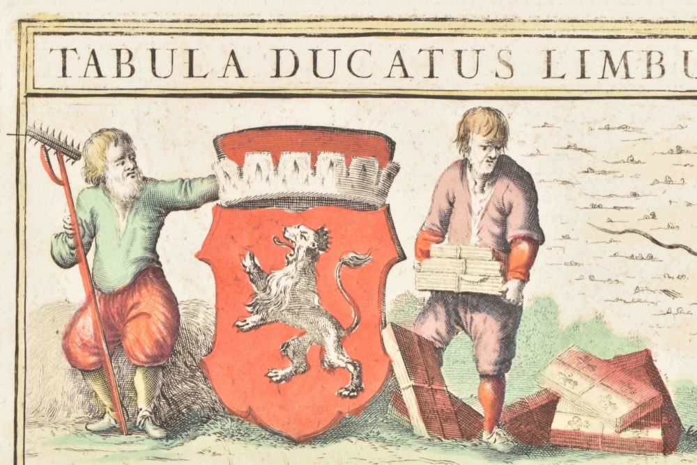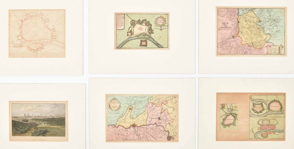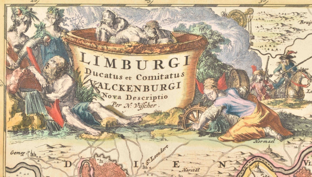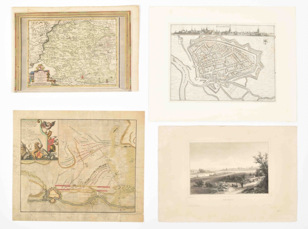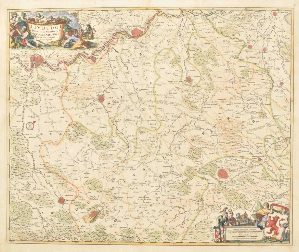 (2) Limburgi Ducarus et Comitatus Valckenburgi. N. Visscher. Ca. 1680. 47.5 x 57 cm. Col., 2 large allegorical cartouches w. title, coat of arms and scales, verso blank. Sl. browned. (3) Tabula Ducatus Limburch et Com. Valckenburch. Amst., F. de Wit, ca. 1700. 47 x 56 cm. 2 cartouches w. coat of arms and scales, col., verso blank. -and 12 other, smaller maps and plans relating to Limburg. Sold as a collection of maps, not subject to return. (total 15)