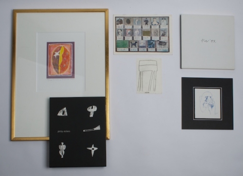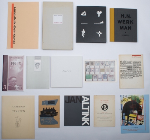 Philip Elchers, 2001. 96 p. bound in cassette. Nr. 53 out of 100 signed and exclusive copies. Multicoloured lithograph by Tissing (in frame). + Klaas Gubbels, Catalogus Quaries van ufford-Prijs, 1971. Stapled, 20 p. With insert leaf and separate etch of "een zeer klein tafeltje". + Fie Werkman, sketches 1970-1990. Egbert Forsten, 1996. Nr. 10 out of 10 copies with original drawing, in cassette - and 11 others, all concerning Werkman/de Ploeg.