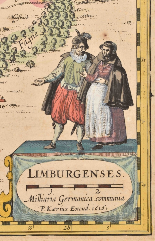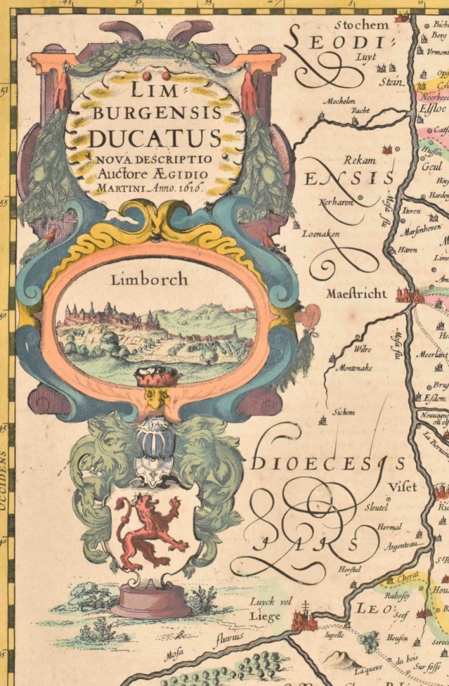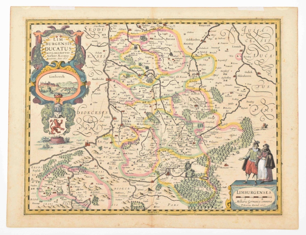 Novo Descriptio. Amst., Pieter van de Keere, 1616. 38 x 49 cm. Col., 2 cartouches w. title, coat of arms, view of Limborgh town in Belgium, scales and Limburg citizens, verso Latin text.