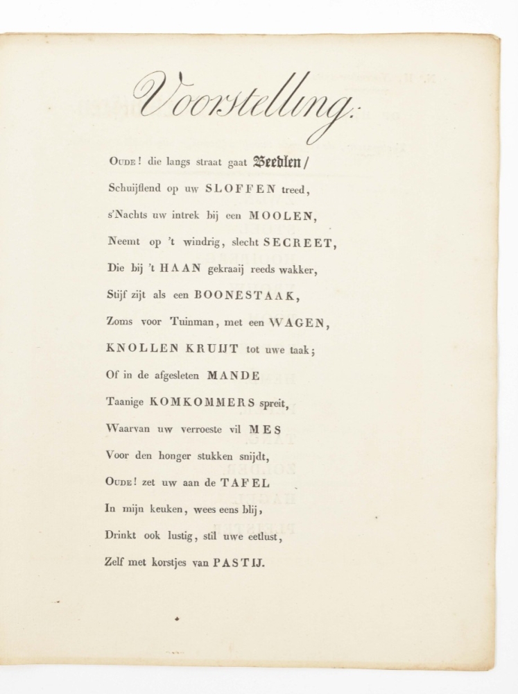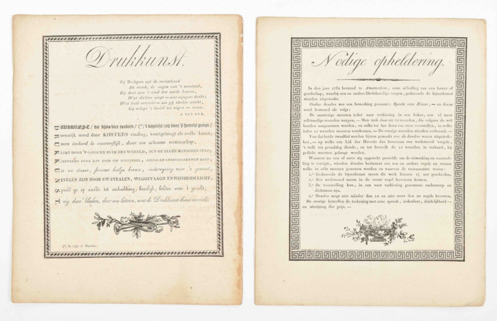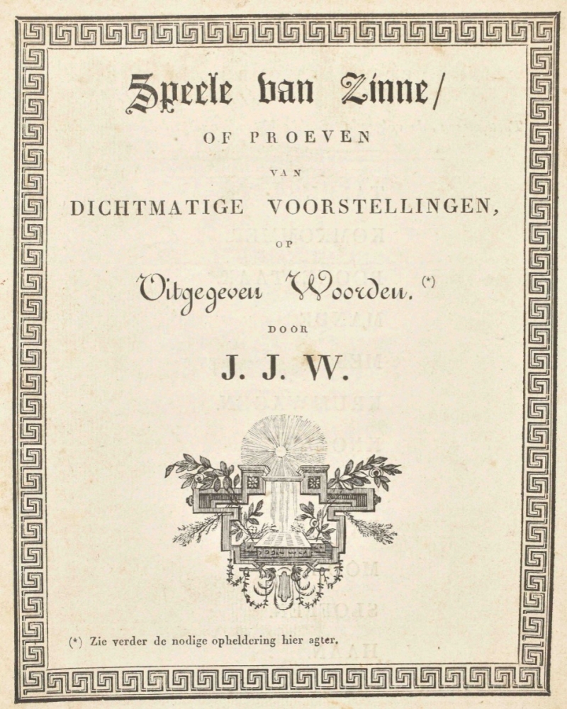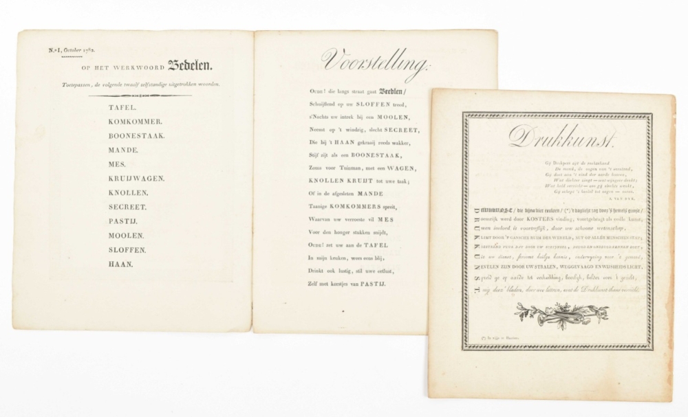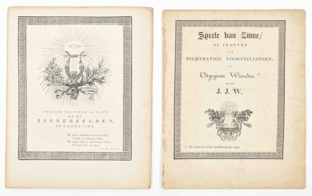Rare, beautifully printed publ., containing 7 poems, the first without title, the others titled: Dichtkunst; Toonkunst; Schilderkunst Bijtelkunst; Rederijk-kunst; and Drukkunst. Each poem is an acrostic and printed vertically. (2) Speele van zinne, of proeven van dichtmatige voorstellingen op uitgegeven woorden. Door J.J.W. N.pl., n.publ., n.d. (ca. 1820). 8 p. 4to. W. wood engr. device on title-p. and wood engr. endpiece, title and final p. within dec. wood engr. borders. Without binding as issued, loose sheets. Very (if not extremely) rare playful publ. Contains 3 parts of 2 pages each (dated October-November 1782), each with a list of "twaalf zelfstandige uitgetrokken woorden", followed by poems ("Voorstelling") using those words and the verbs "Bedelen", "Verkwisten" and "Overwegen". (total 2)