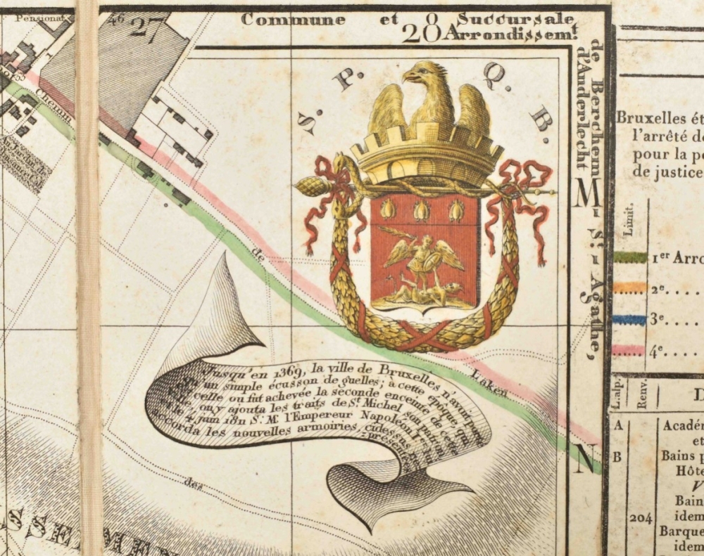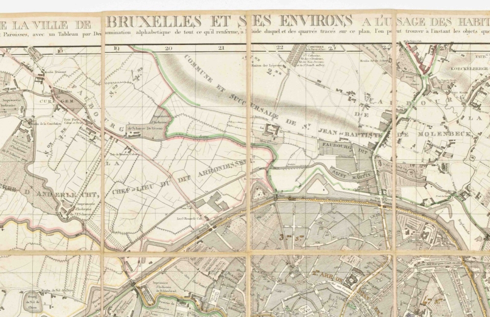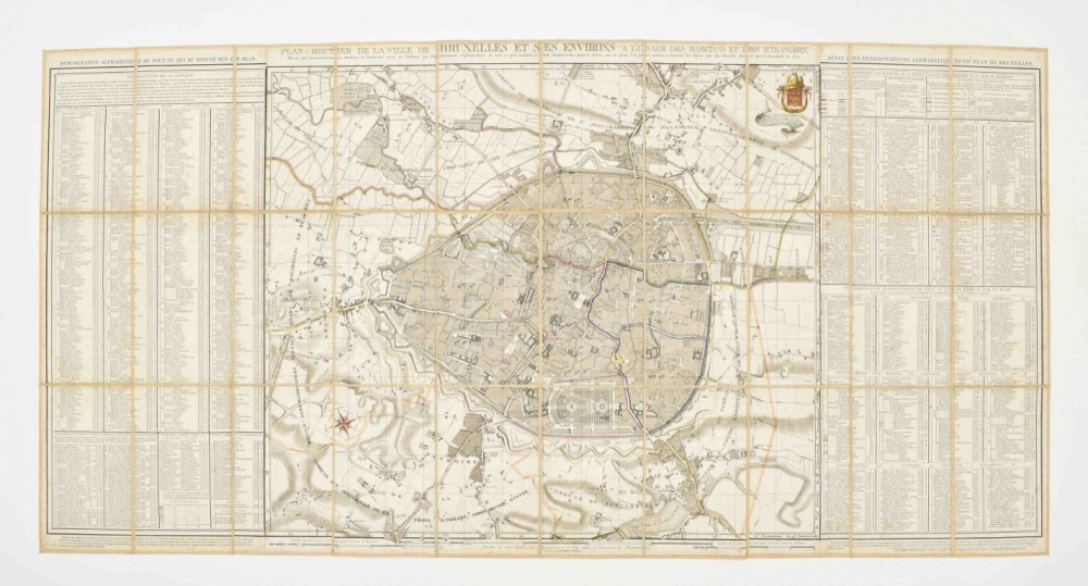 de la ville de Bruxelles et ses environs. G. Jacowick, 1812. 30 segments w. town plan, coat of arms and street list.