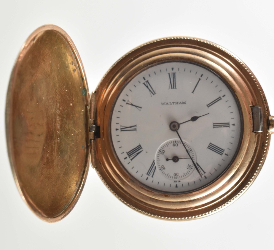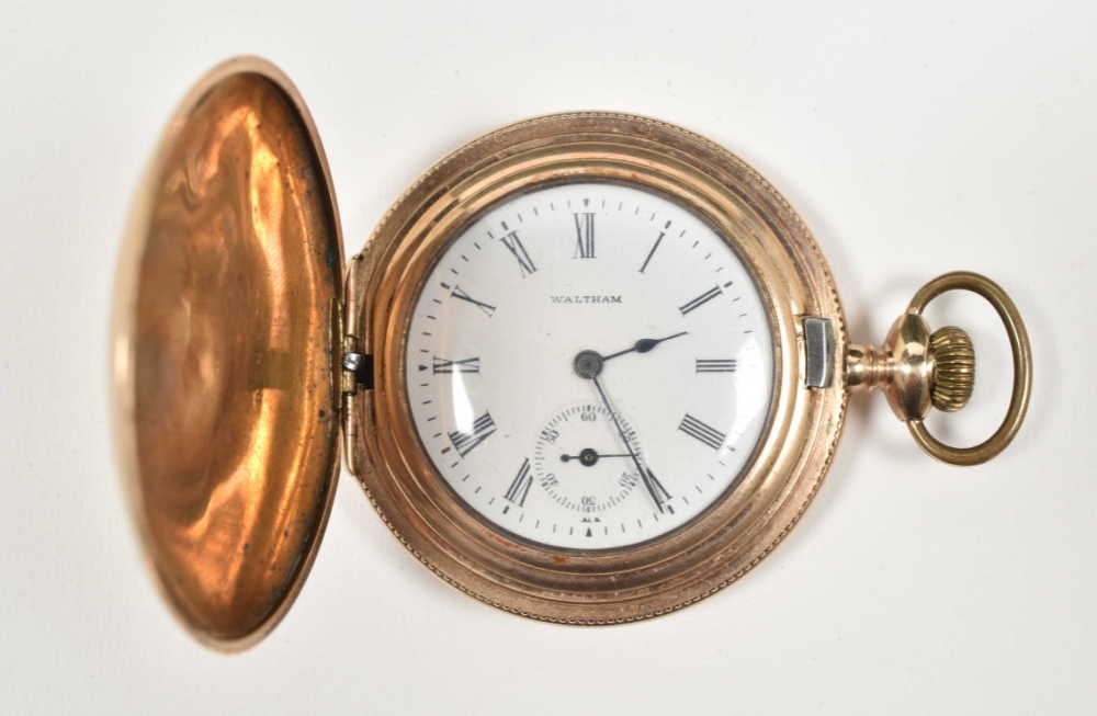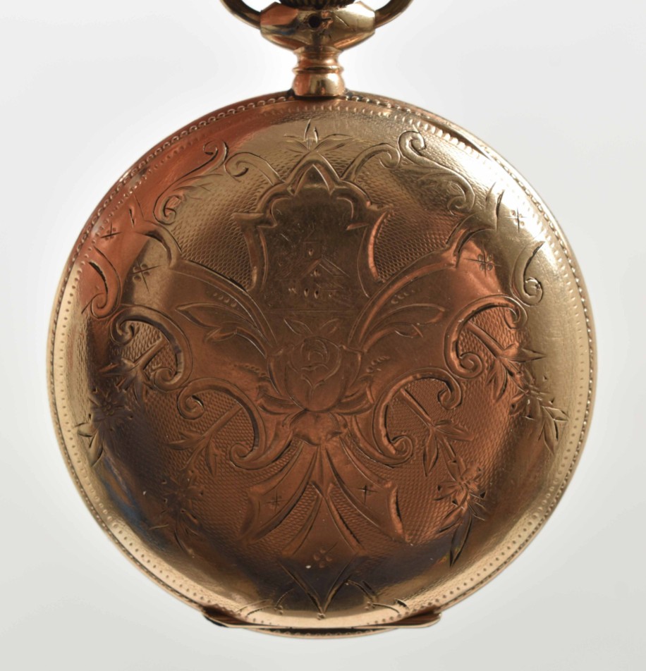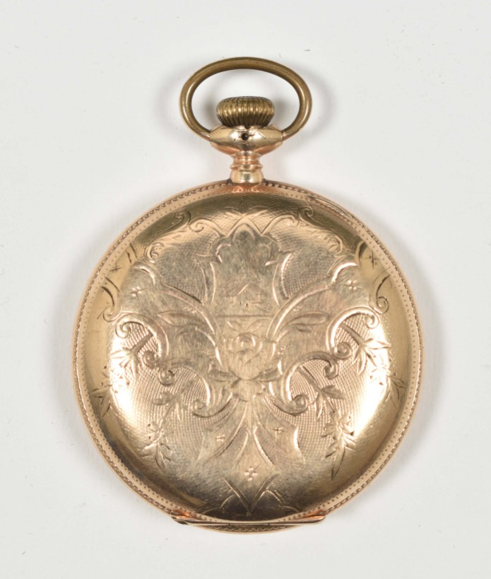 Gold Waltham pocket watch, 4.8 cm in diameter, the outer case dec. in low relief, signed in the steel at the back of the mechanism "American Waltham Watch Co.".