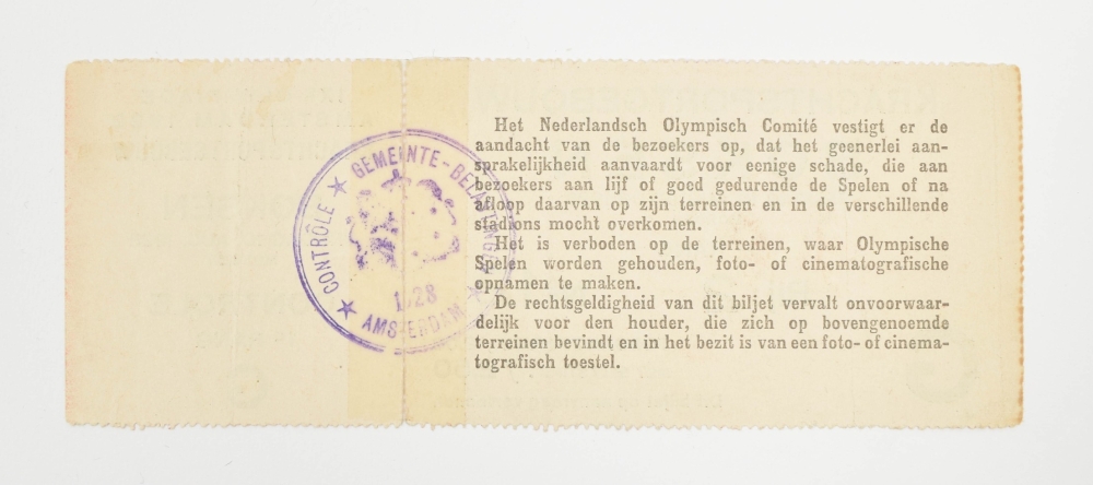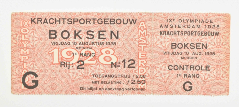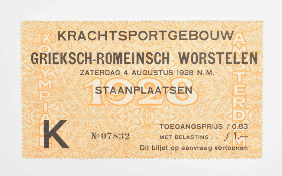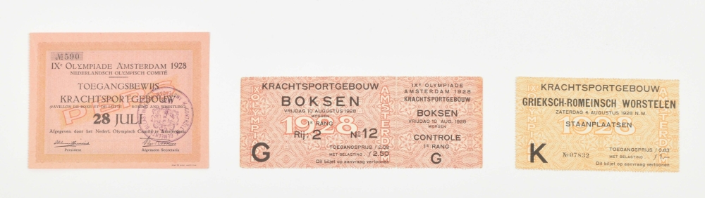 (1) Boxing. Ticket w. counterfoil still attached. The event took place in het Krachtsportgebouw. (2) Standing place ticket for Grieksch-Romeinsch worstelen (Wrestling) on 4 August. (3) Press card for the strength sports competition at the Olympic Games 1928.