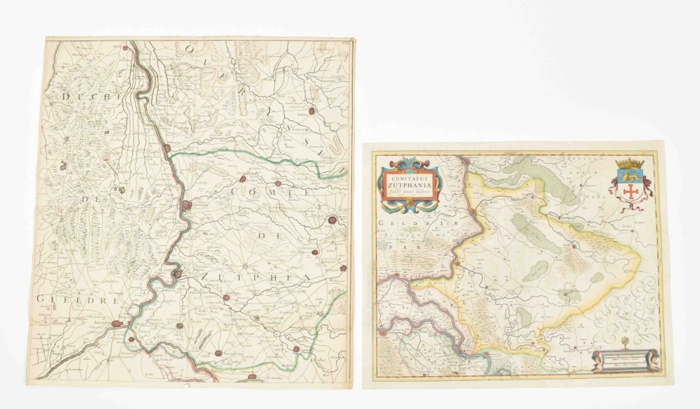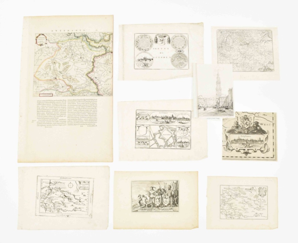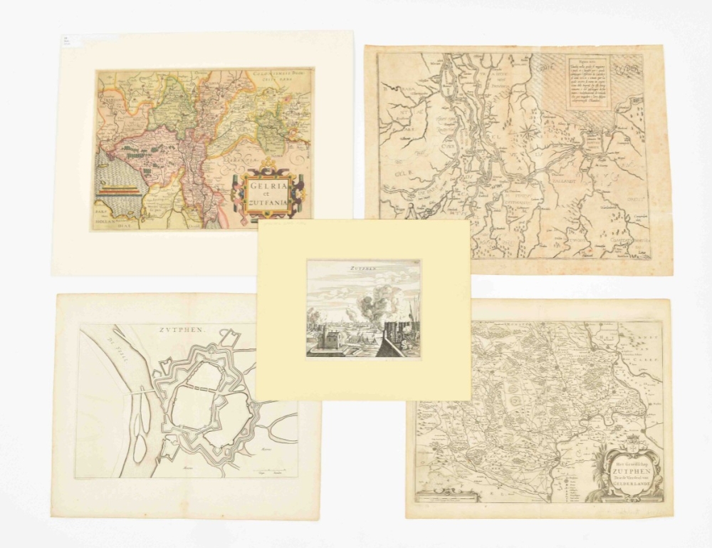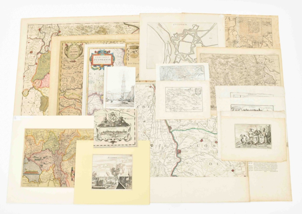 (2) Nic. v. Geelckerken. Comitatus Zutphania. Amst., H. Hondius, ca. 1630. Folio. Col., sides cropped. (3) Comitatus Zutphania. Amst., J. Janssonius, ca. 1650. Folio. Col., doubled. (4) Comitatus Zutphaniae sive Geldriae Tetrachiae Zutphaniensis Isalae Fluvii (...). Amst., F. de Witt, ca. 1700. Folio. Faded col. Added: 14 smaller and later maps and prints in different sizes, mostly copper engr. (total 18)