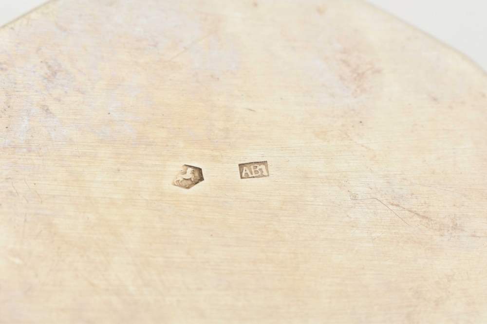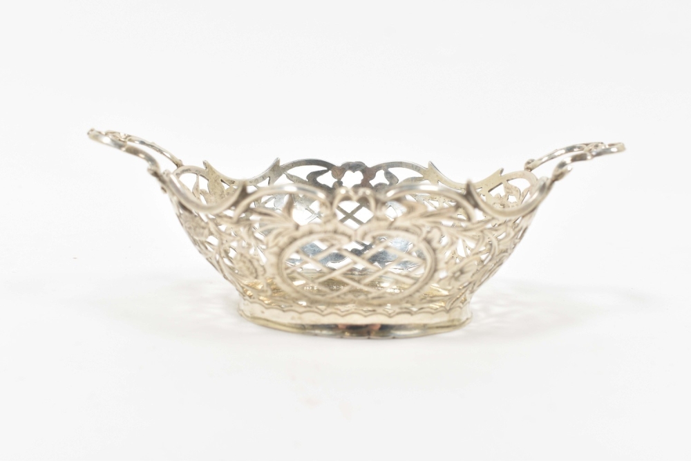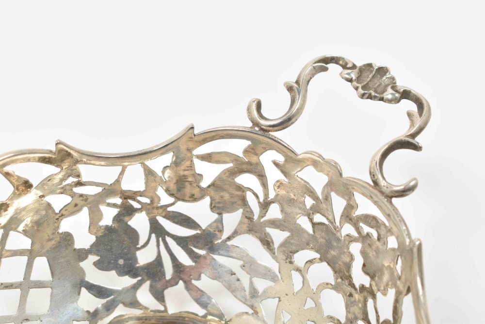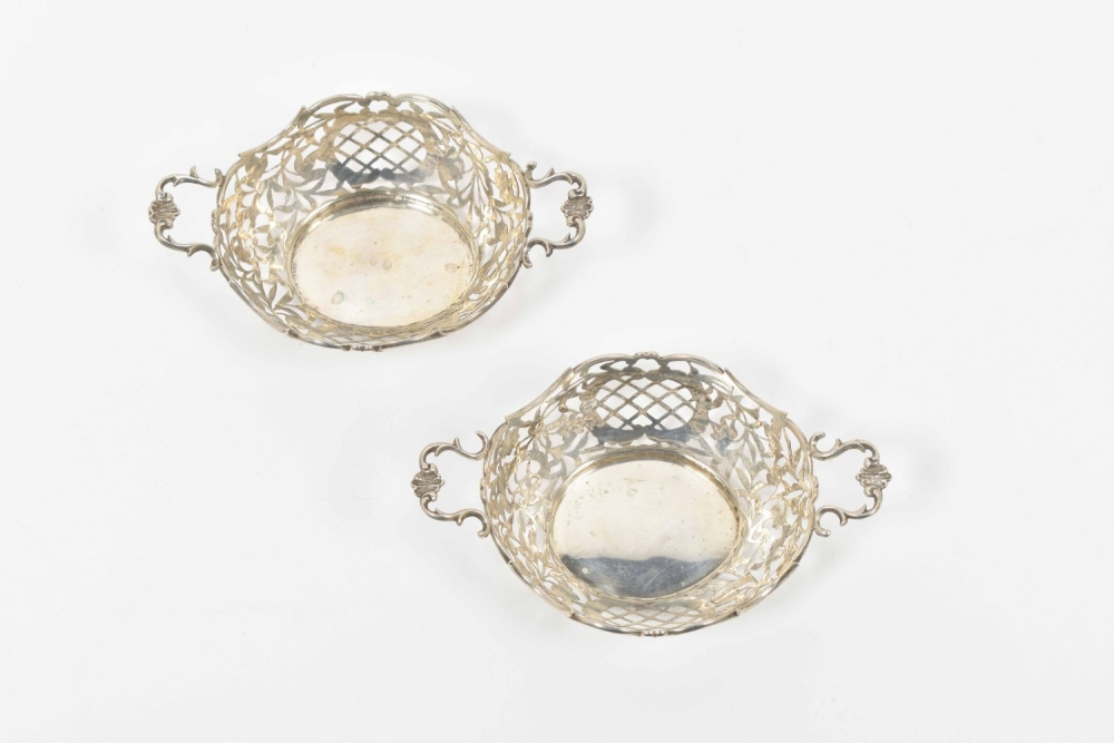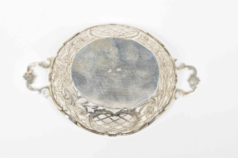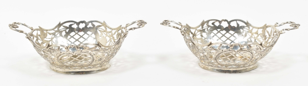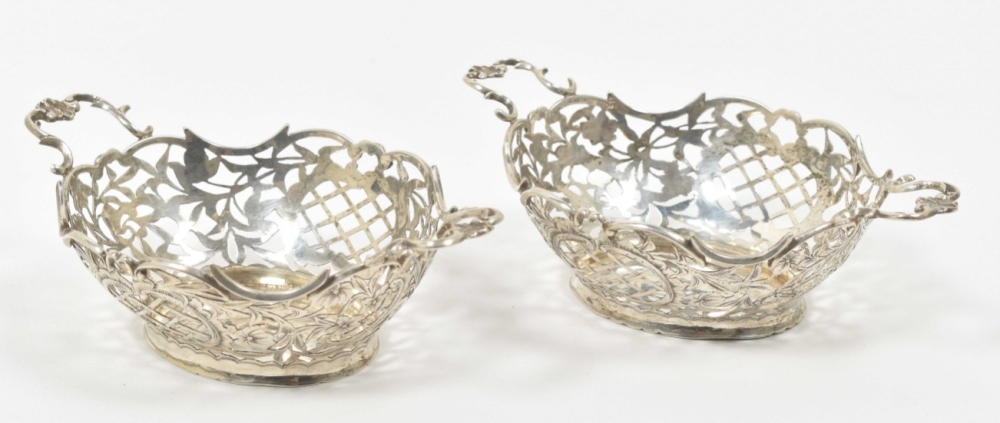 2nd degree silver, w. openwork dec. of flowers and c-curls, one of them hallmarked w. year-letter gothic "N" for 1897 in the stand, with lion passant for 2nd degree silver and maker's-mark "ABI" and some other, unidentified hall marks on the bottom and the handles, 16.5 x 10.5 x 5 cm each.