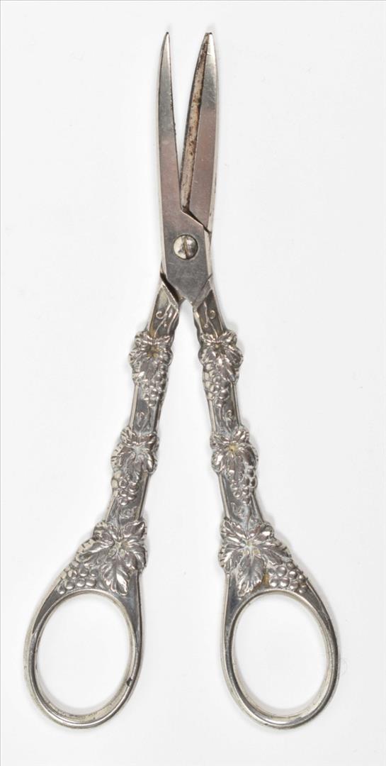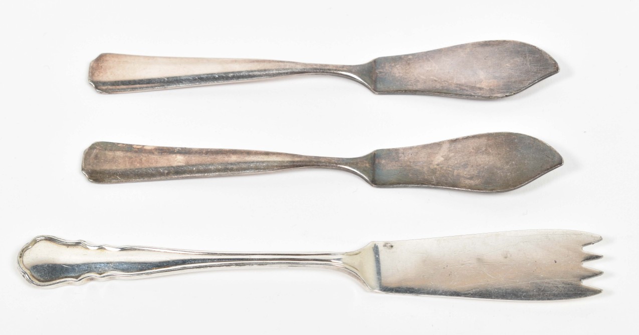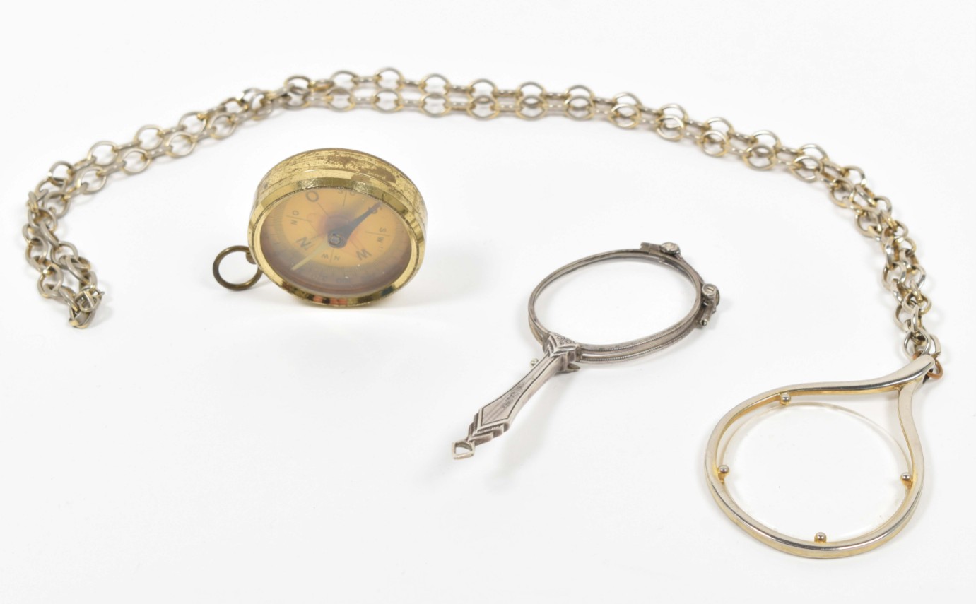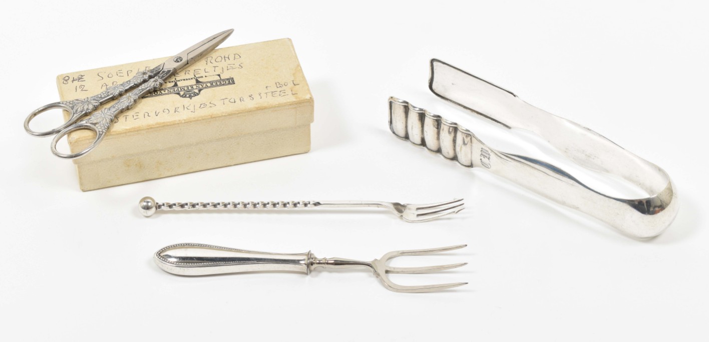 Incl.: silver plated spoons; knives; forks; bread tongs; a pair of scissors; a magnifying glass on a chain; a pair of foldable eyeglasses marked "835" between the lenses; 3 sm. mother-of-pearl spoons; and a sm. brass compass.